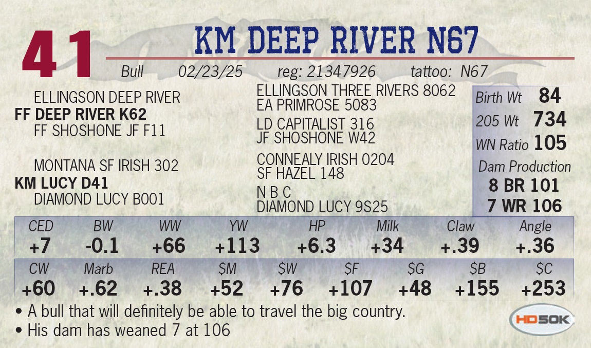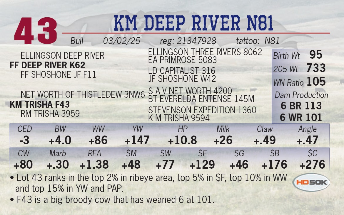 | KM DEEP RIVER N81 | 43 | Yearling Bull | • Lot 43 ranks in the top 2% in ribeye area, top 5% in $F, top 10% in WW and top 15% in YW and PAP. • F43 is a big broody cow that has weaned 6 at 101. |