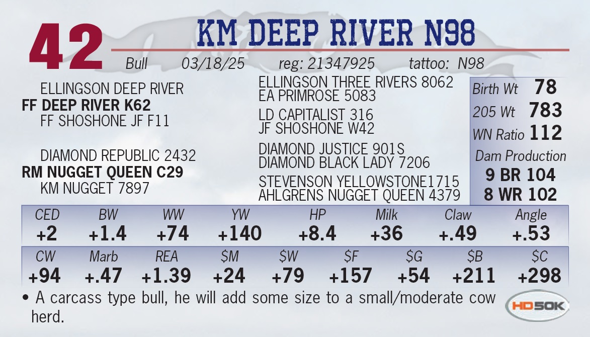 | KM DEEP RIVER N98 | 42 | Yearling Bull | • A carcass type bull, he will add some size to a small/moderate cow herd. |
