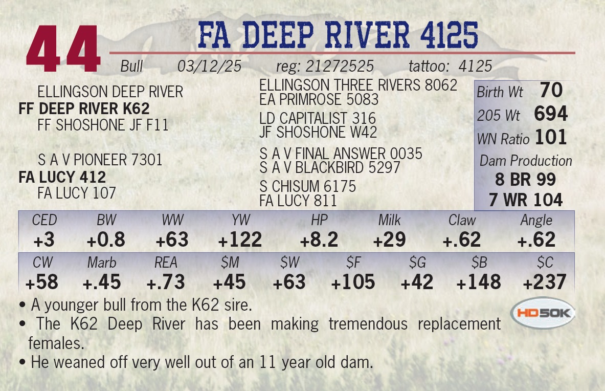 | FA DEEP RIVER 4125 | 44 | Yearling Bull | • A younger bull from the K62 sire. • The K62 Deep River has been making tremendous replacement females. • He weaned off very well out of an 11 year old dam. |