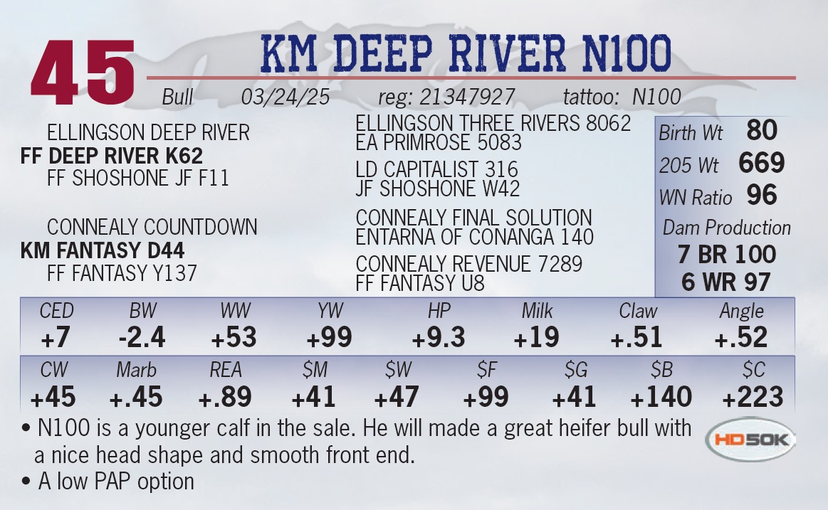 | KM DEEP RIVER N100 | 45 | Yearling Bull | • N100 is a younger calf in the sale. He will made a great heifer bull with a nice head shape and smooth front end. • A low PAP option |