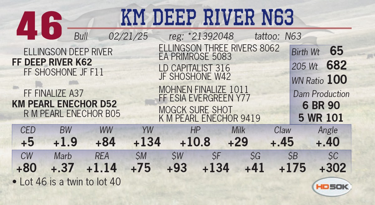 | KM DEEP RIVER N63 | 46 | Yearling Bull | • Lot 46 is a twin to lot 40 |