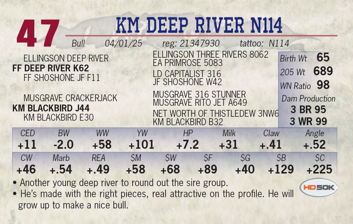 | KM DEEP RIVER N114 | 47 | Yearling Bull | • Another young deep river to round out the sire group. • He’s made with the right pieces, real attractive on the profile. He will grow up to make a nice bull. |