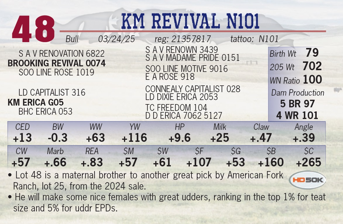 | KM REVIVAL N101 | 48 | Yearling Bull | • Lot 48 is a maternal brother to another great pick by American Fork Ranch, lot 25, from the 2024 sale. • He will make some nice females with great udders, ranking in the top 1% for teat size and 5% for uddr EPDs. |