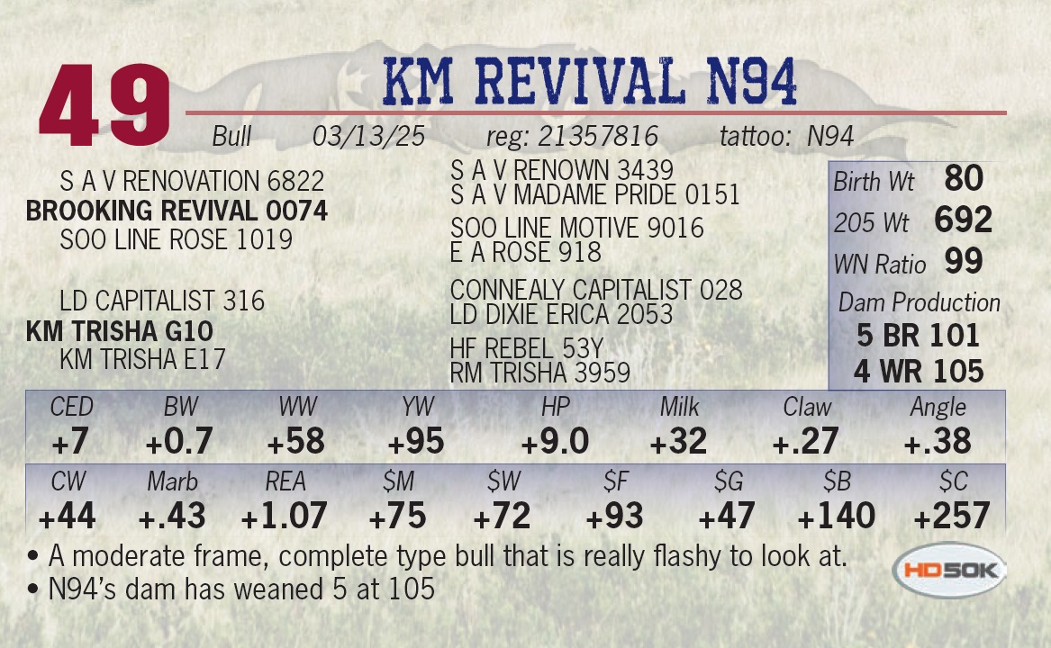 | KM REVIVAL N94 | 49 | Yearling Bull | • A moderate frame, complete type bull that is really flashy to look at. • N94’s dam has weaned 5 at 105 |
