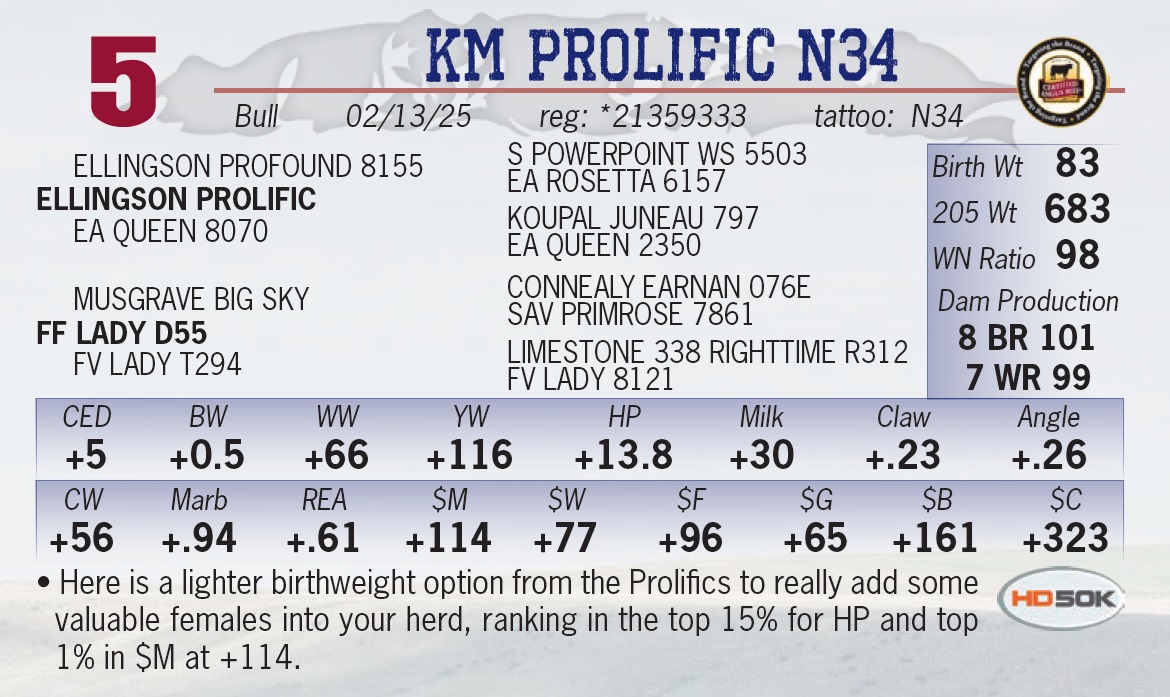 | KM PROLIFIC N34 | 5 | Yearling Bull | • Here is a lighter birthweight option from the Prolifics to really add some valuable females into your herd, ranking in the top 15% for HP and top 1% in $M at +114. |