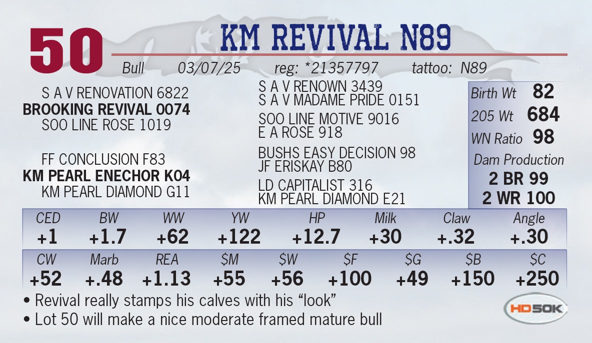 | KM REVIVAL N89 | 50 | Yearling Bull | • Revival really stamps his calves with his “look” • Lot 50 will make a nice moderate framed mature bull |