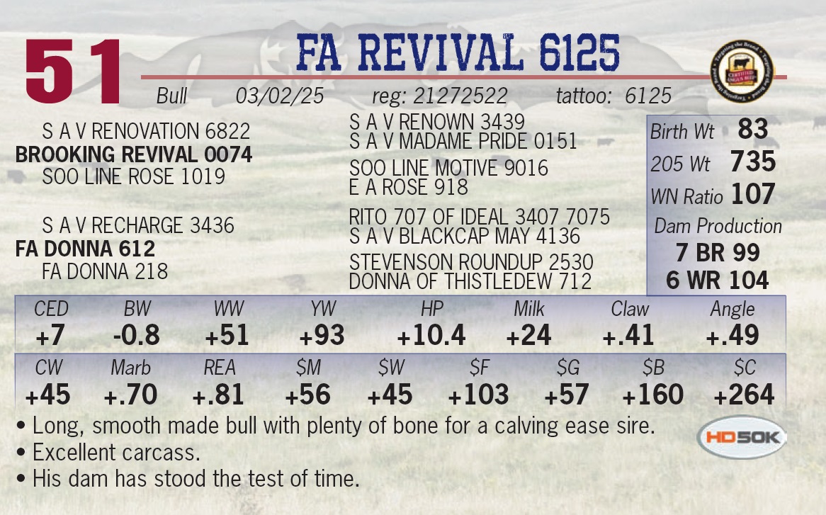 | FA REVIVAL 6125 | 51 | Yearling Bull | • Long, smooth made bull with plenty of bone for a calving ease sire. • Excellent carcass. • His dam has stood the test of time. |