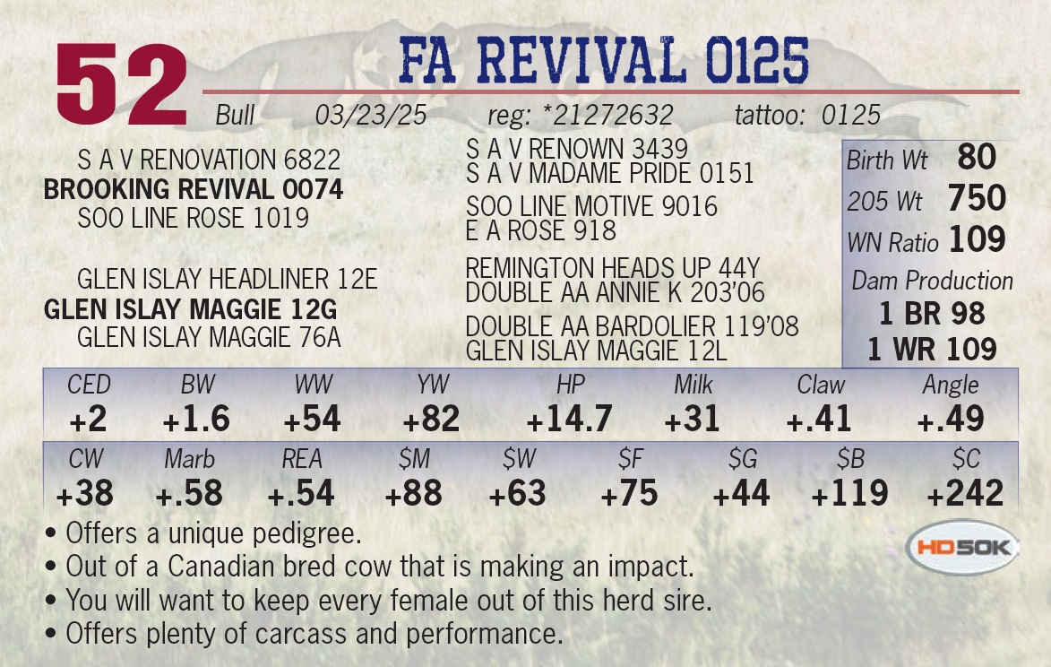 | FA REVIVAL 0125 | 52 | Yearling Bull | • Offers a unique pedigree. • Out of a Canadian bred cow that is making an impact. • You will want to keep every female out of this herd sire. • Offers plenty of carcass and performance. |