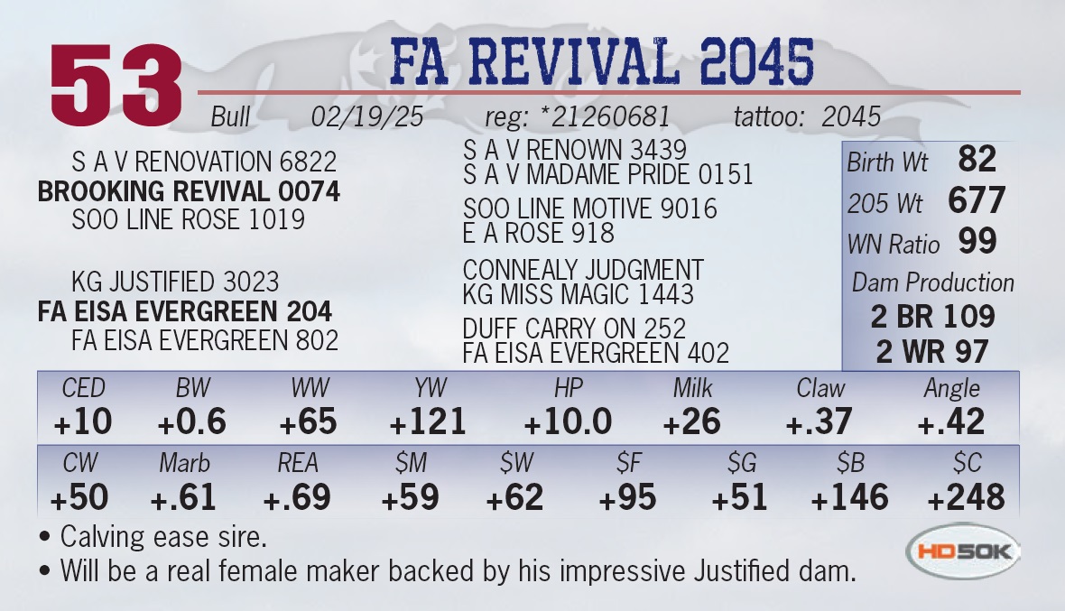 | FA REVIVAL 2045 | 53 | Yearling Bull | • Calving ease sire. • Will be a real female maker backed by his impressive Justified dam. |