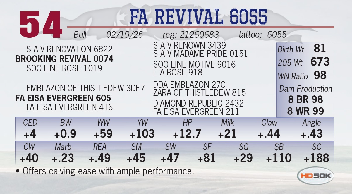 | FA REVIVAL 6055 | 54 | Yearling Bull | • Offers calving ease with ample performance. |
