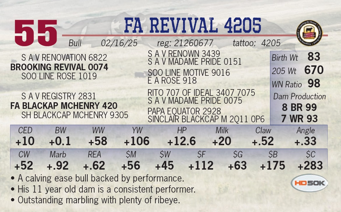 | FA REVIVAL 4205 | 55 | Yearling Bull | • A calving ease bull backed by performance. • His 11 year old dam is a consistent performer. • Outstanding marbling with plenty of ribeye. |