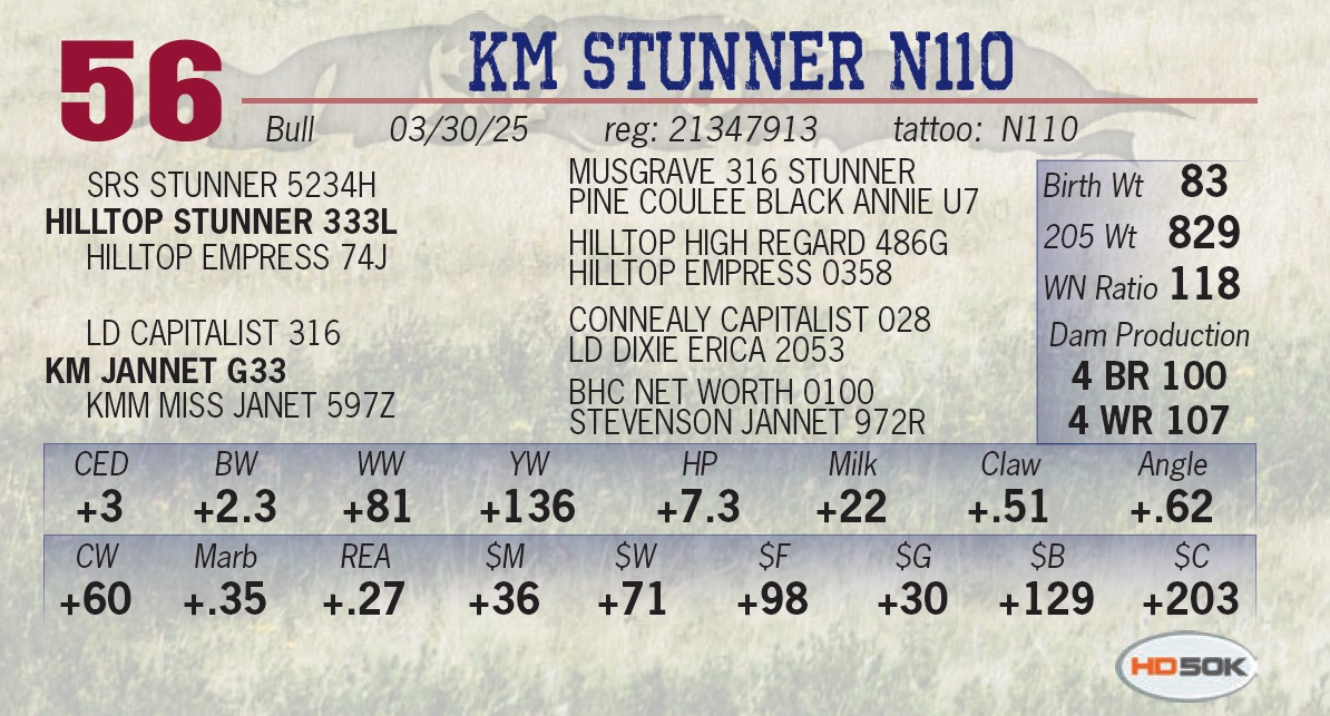 | KM STUNNER N110 | 56 | Yearling Bull | • Lot 56 is one of the youngest calves in the sale, and posts the heaviest adjusted weaning weights. He comes from a big brood cow we have nicknamed “Moose.” She has weaned 4 at 107 • He’s green but if you can see the potential in this calf he will make a really nice bull. • A maternal brother to lot 16, Tim Sundlings $7000 choice of our 2024 sale. • We have had good luck with the Stunner sire group, adding a lot of mass and style to our calves, which caused us to choose this Hilltop sire from their 2024 sale. |