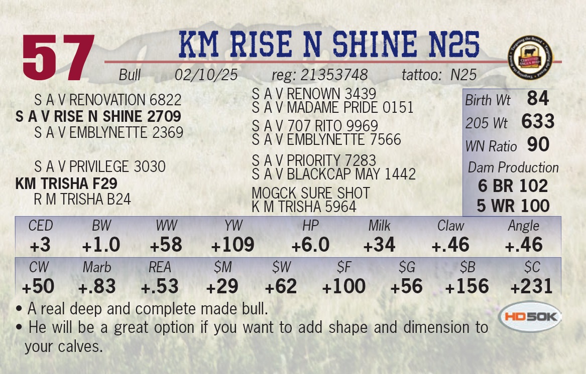 | KM RISE N SHINE N25 | 57 | Yearling Bull | • A real deep and complete made bull. • He will be a great option if you want to add shape and dimension to your calves. |