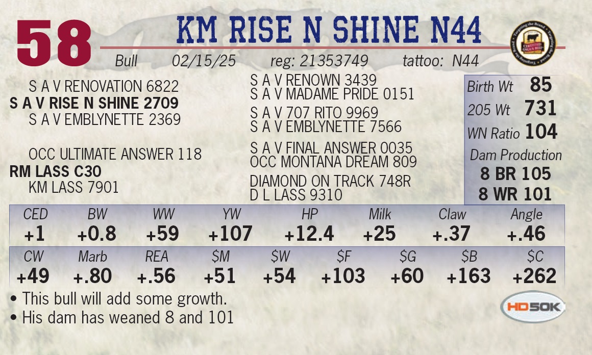 | KM RISE N SHINE N44 | 58 | Yearling Bull | • This bull will add some growth. • His dam has weaned 8 and 101 |