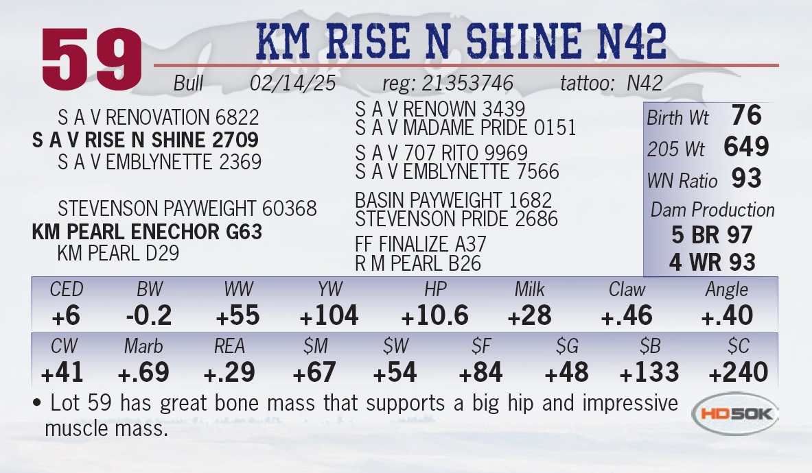 | KM RISE N SHINE N42 | 59 | Yearling Bull | • Lot 59 has great bone mass that supports a big hip and impressive muscle mass. |