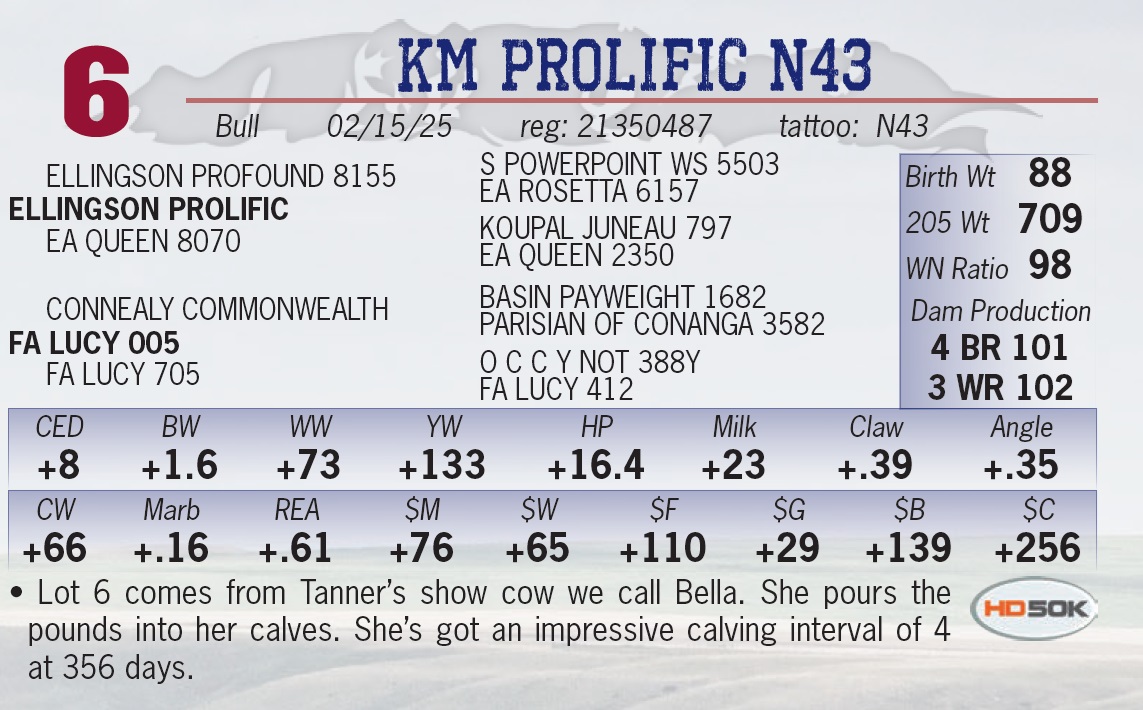 | KM PROLIFIC N43 | 6 | Yearling Bull | • Lot 6 comes from Tanner’s show cow we call Bella. She pours the pounds into her calves. She’s got an impressive calving interval of 4 at 356 days. |