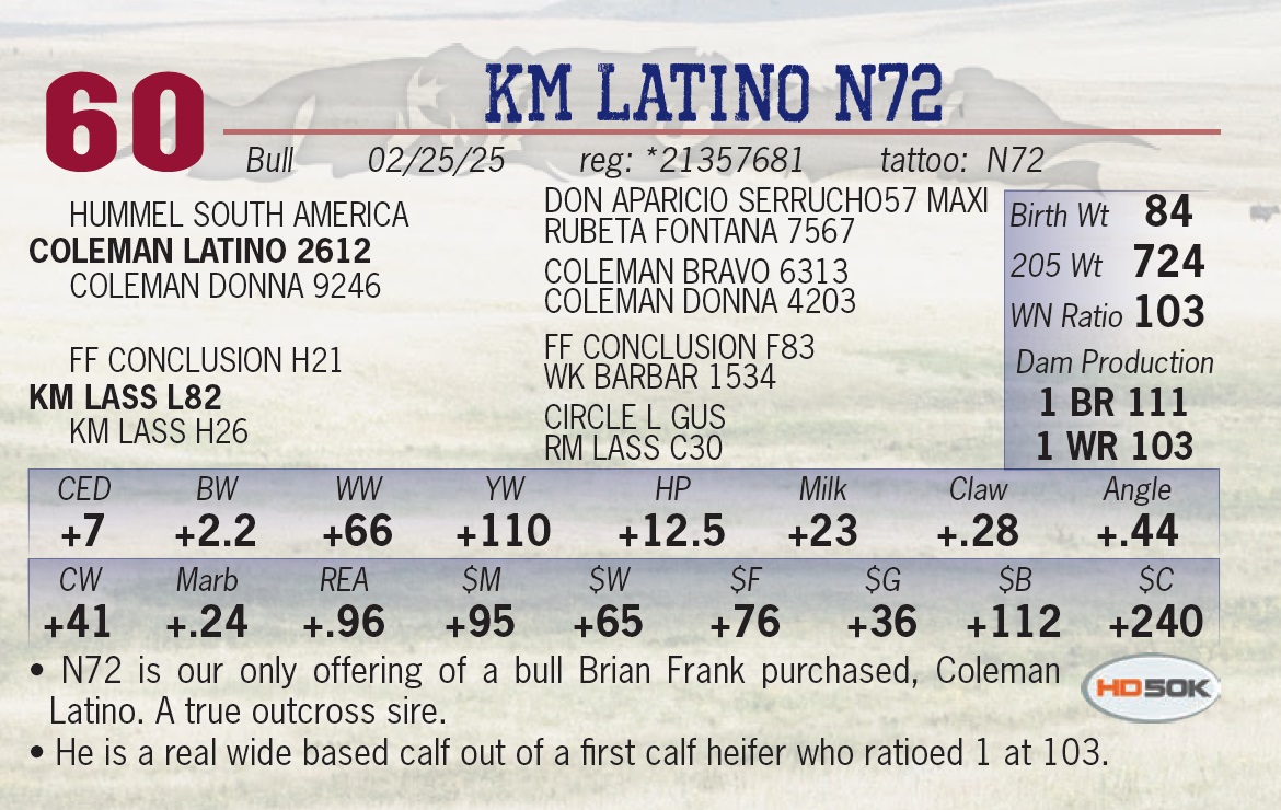 | KM LATINO N72 | 60 | Yearling Bull | • N72 is our only offering of a bull Brian Frank purchased, Coleman Latino. A true outcross sire. • He is a real wide based calf out of a first calf heifer who ratioed 1 at 103. |