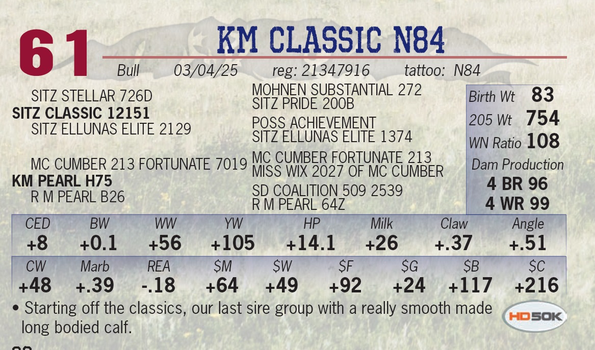 | KM CLASSIC N84 | 61 | Yearling Bull | • Starting off the classics, our last sire group with a really smooth made long bodied calf. |