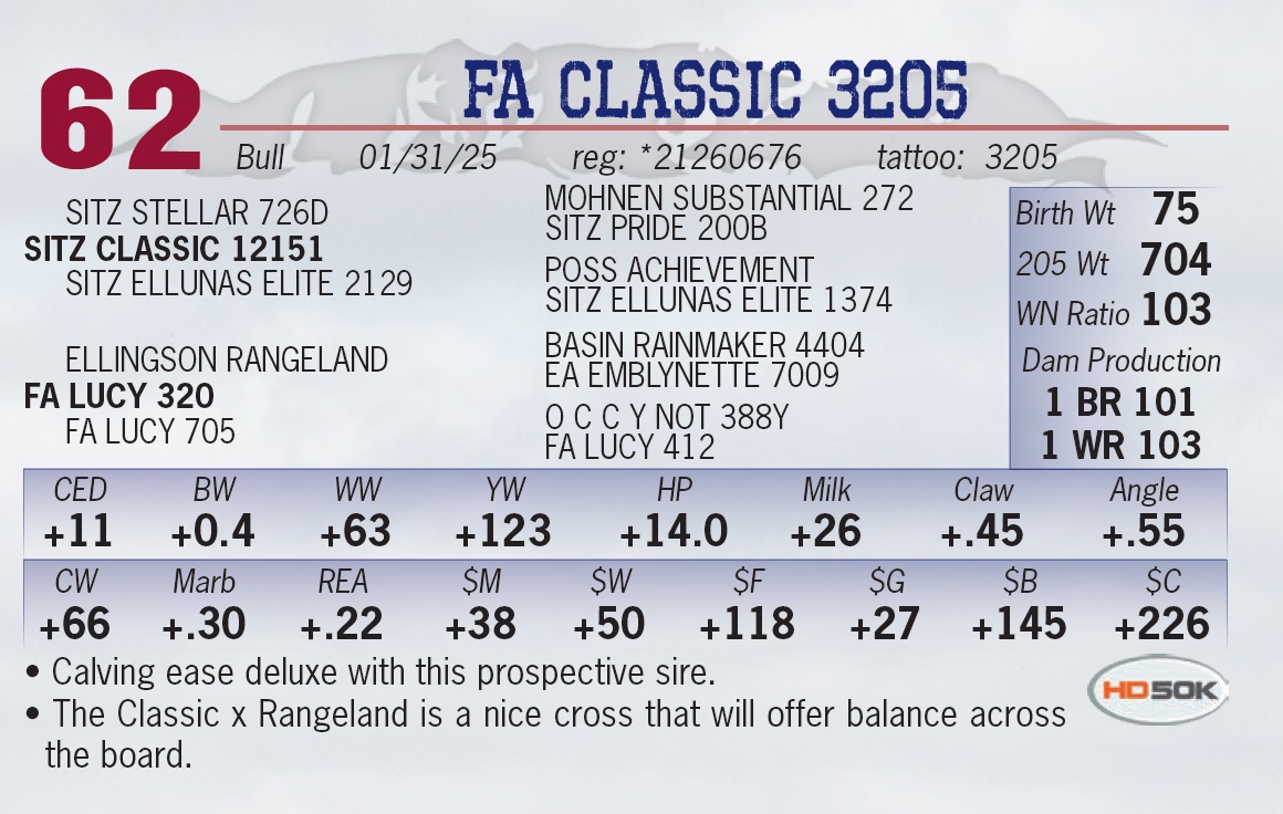 | FA CLASSIC 3205 | 62 | Yearling Bull | • Calving ease deluxe with this prospective sire. • The Classic x Rangeland is a nice cross that will offer balance across the board. |