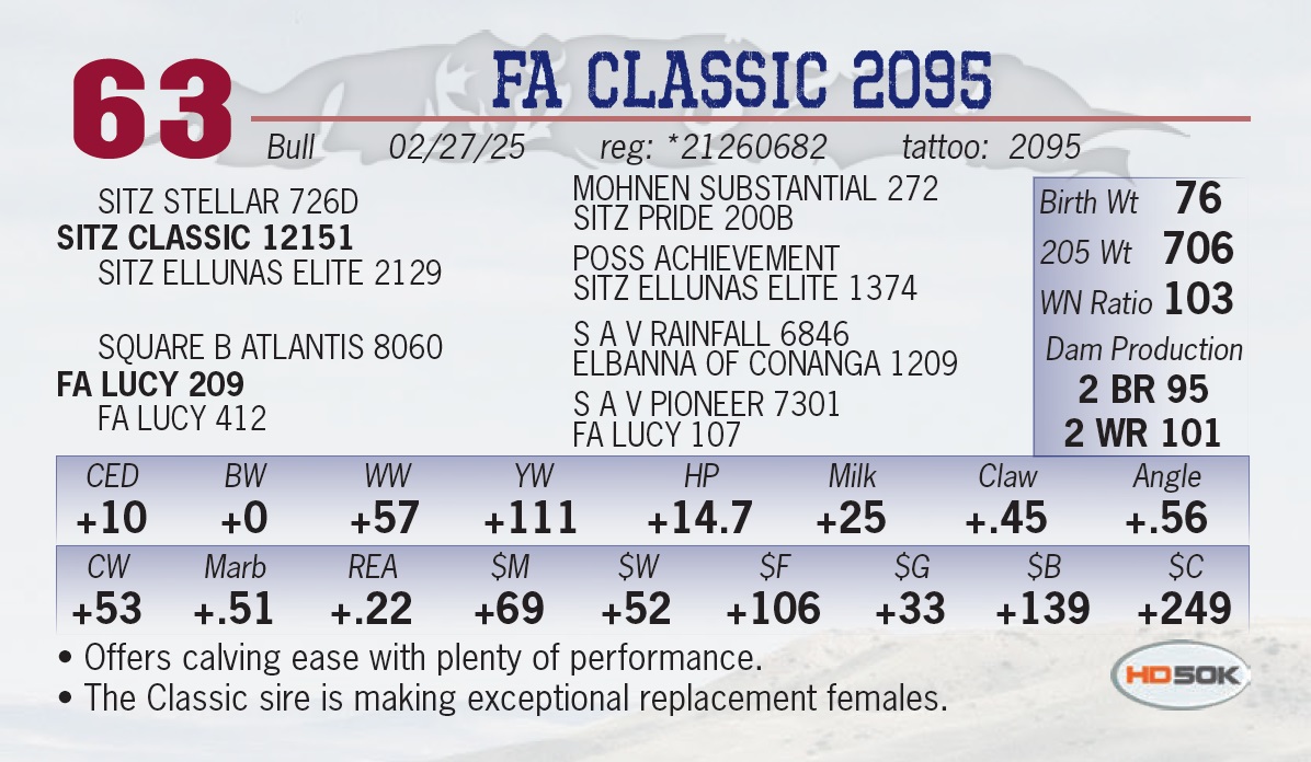 | FA CLASSIC 2095 | 63 | Yearling Bull | • Offers calving ease with plenty of performance. • The Classic sire is making exceptional replacement females. |