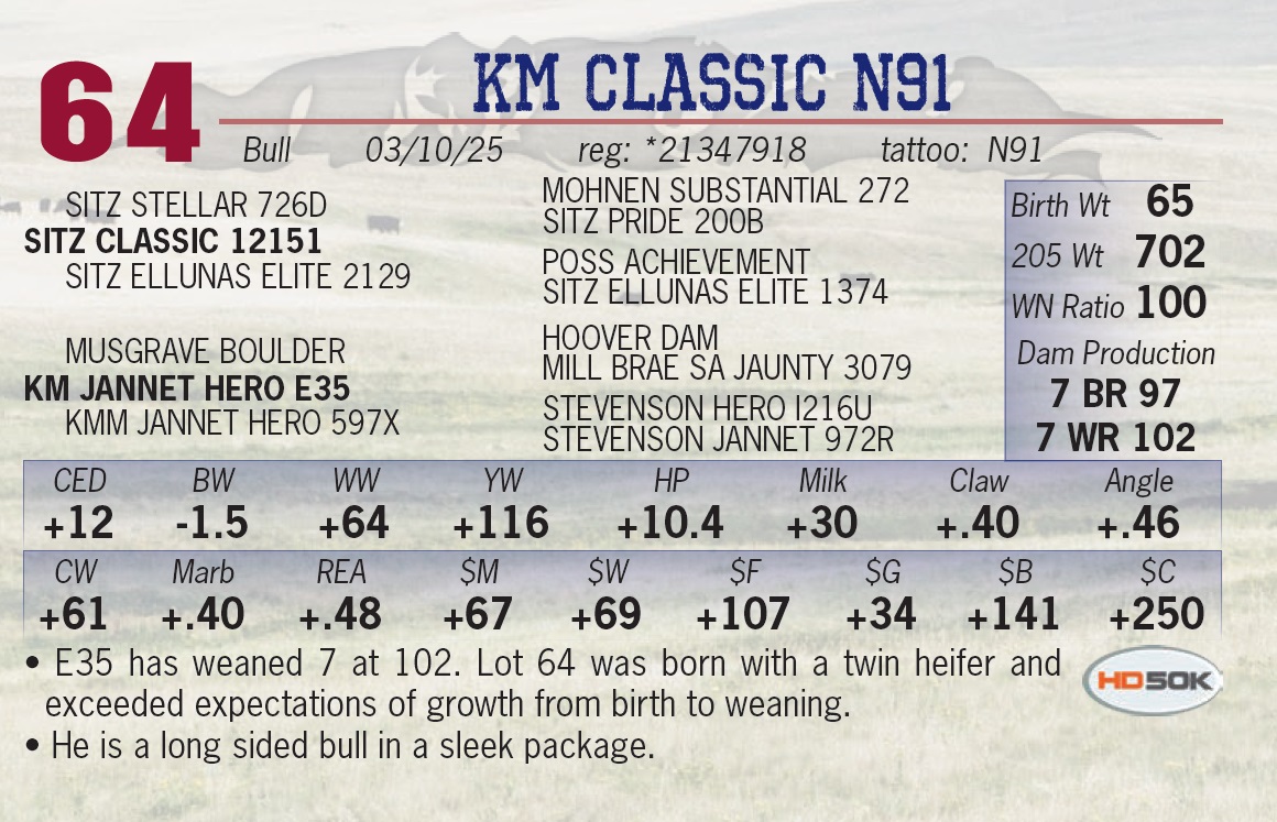 | KM CLASSIC N91 | 64 | Yearling Bull | • E35 has weaned 7 at 102. Lot 64 was born with a twin heifer and exceeded expectations of growth from birth to weaning. • He is a long sided bull in a sleek package. |