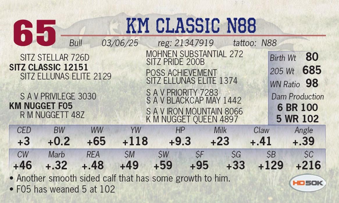 | KM CLASSIC N88 | 65 | Yearling Bull | • Another smooth sided calf that has some growth to him. • F05 has weaned 5 at 102 |