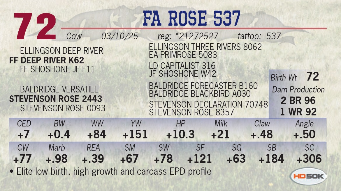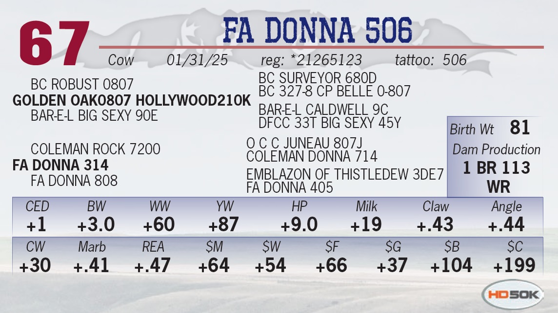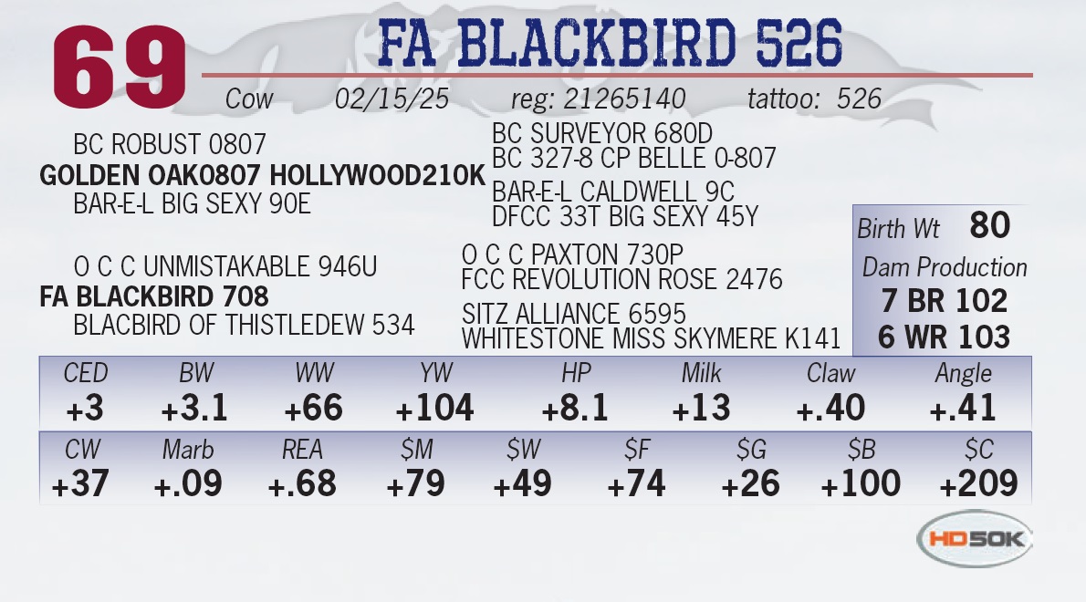 • Posted the heaviest 205 day weight for Frank Angus. • The Revival/Justified cross guaranteed to be a deluxe female maker. • Offers calving ease with loads of performance.
