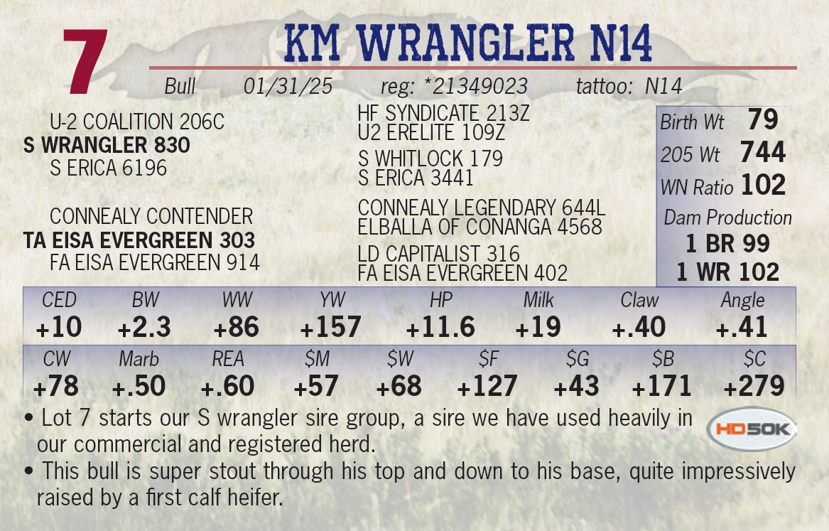 | KM WRANGLER N14 | 7 | Yearling Bull | • Lot 7 starts our S wrangler sire group, a sire we have used heavily in our commercial and registered herd. • This bull is super stout through his top and down to his base, quite impressively raised by a first calf heifer. |