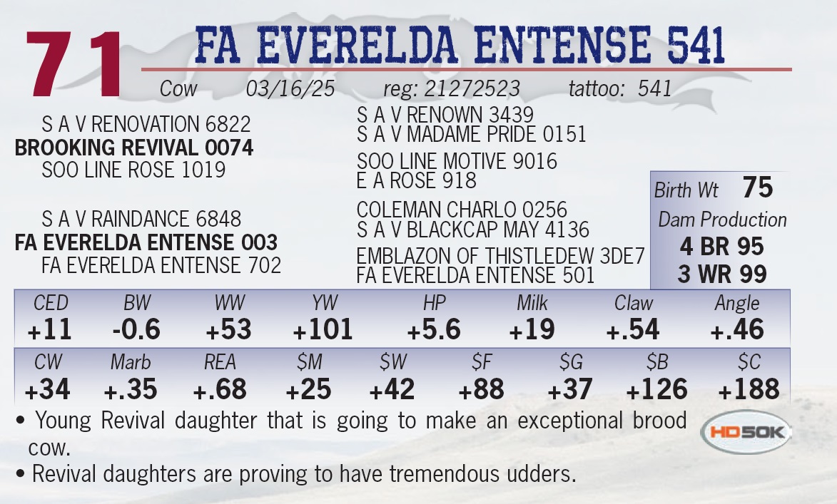 • An eye catching bull. • A sleep-all-night kind of heifer bull. • Long and smooth made. • The Revival/Rangeland combination are sure fire cow makers.