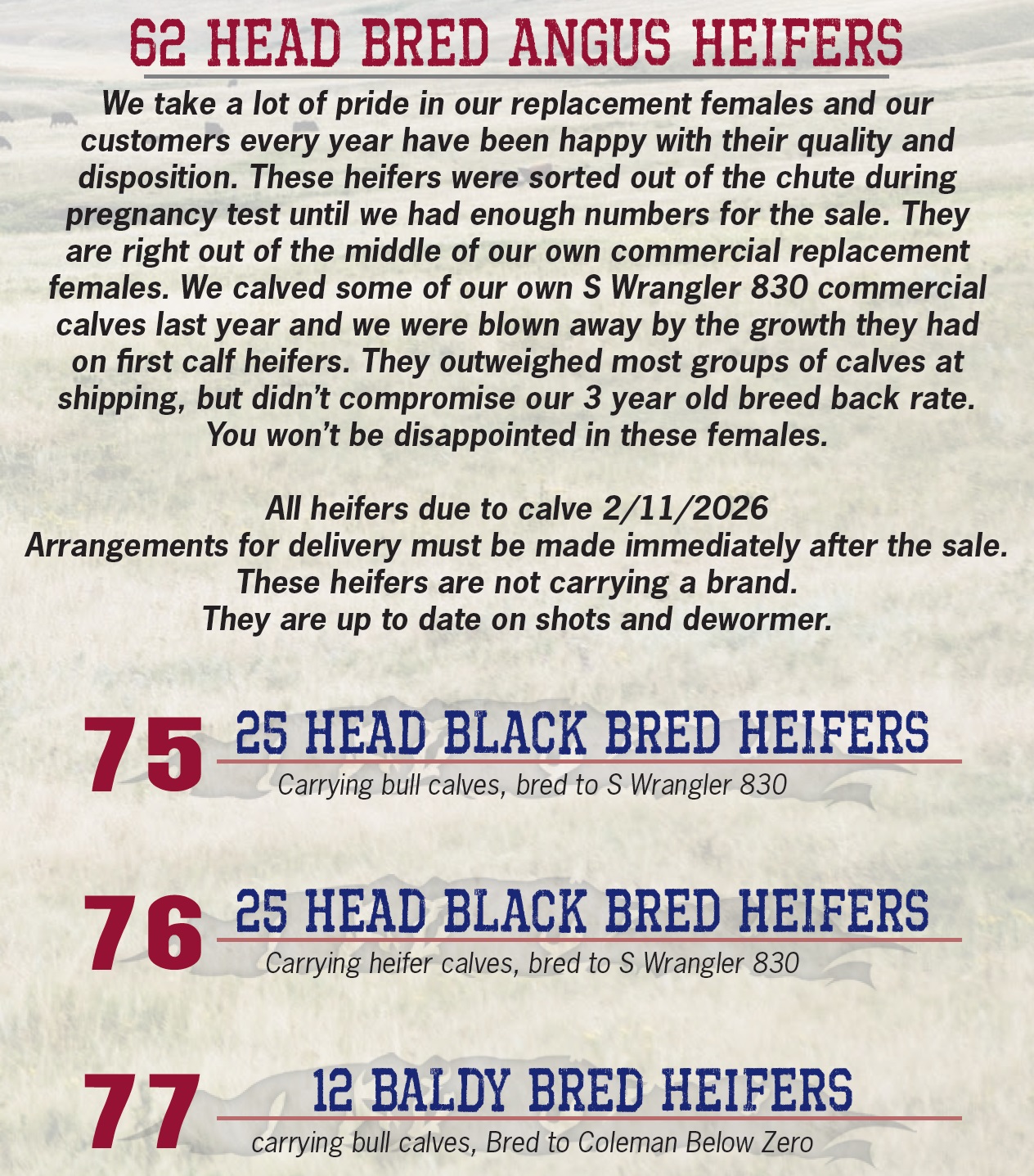 We take a lot of pride in our replacement females and our customers every year have been happy with their quality and disposition. These heifers were sorted out of the chute during pregnancy test until we had enough numbers for the sale. They are right out of the middle of our own commercial replacement females. We calved some of our own S Wrangler 830 commercial calves last year and we were blown away by the growth they had on first calf heifers. They outweighed most groups of calves at shipping, but didn’t compromise our 3 year old breed back rate. You won’t be disappointed in these females. All heifers due to calve 2/11/2026 Arrangements for delivery must be made immediately after the sale. These heifers are not carrying a brand. They are up to date on shots and dewormer.