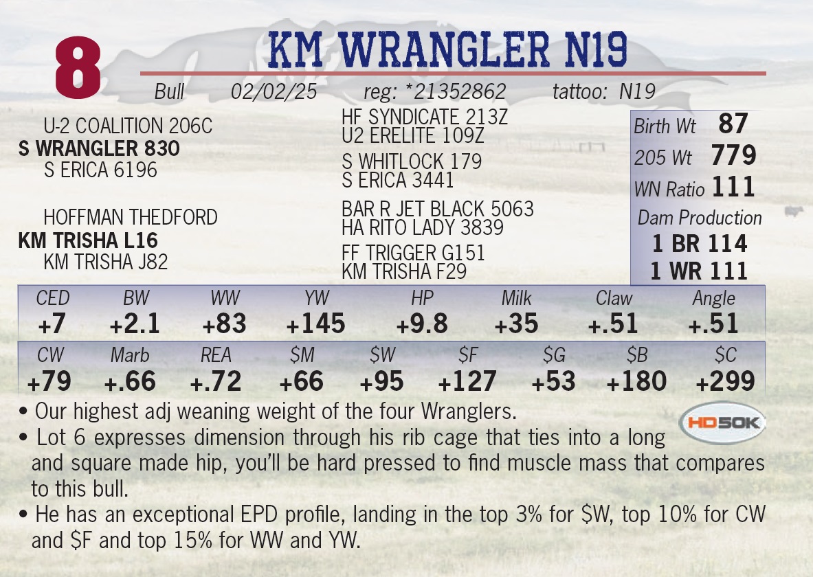 | KM WRANGLER N19 | 8 | Yearling Bull | • Our highest adj weaning weight of the four Wranglers. • Lot 6 expresses dimension through his rib cage that ties into a long and square made hip, you’ll be hard pressed to find muscle mass that compares to this bull. • He has an exceptional EPD profile, landing in the top 3% for $W, top 10% for CW and $F and top 15% for WW and YW. |