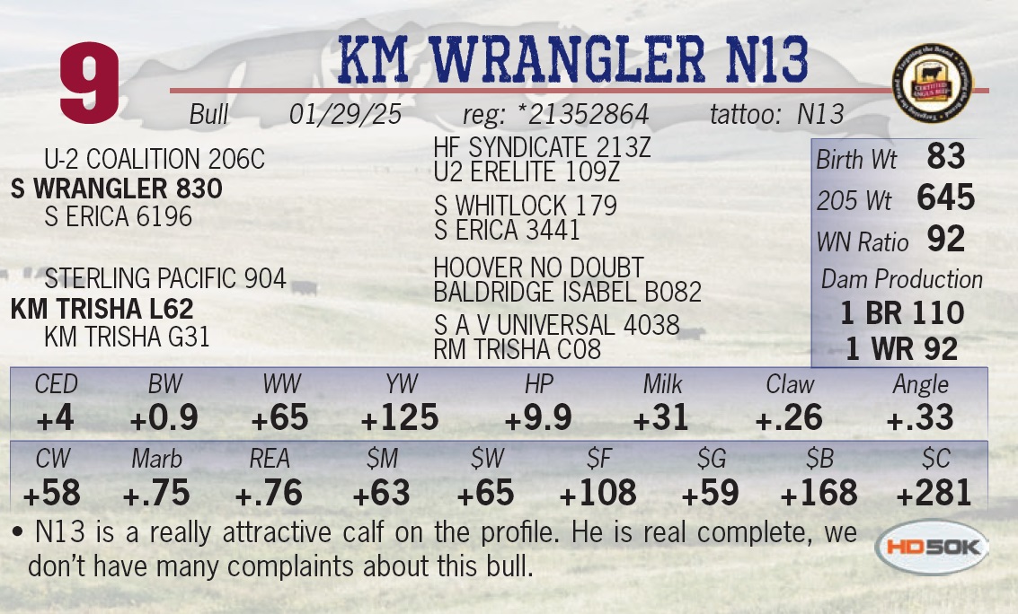 | KM WRANGLER N13 | 9 | Yearling Bull | • N13 is a really attractive calf on the profile. He is real complete, we don’t have many complaints about this bull. |