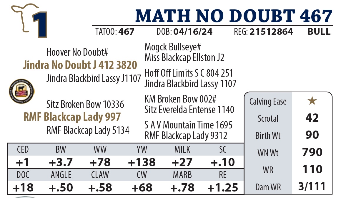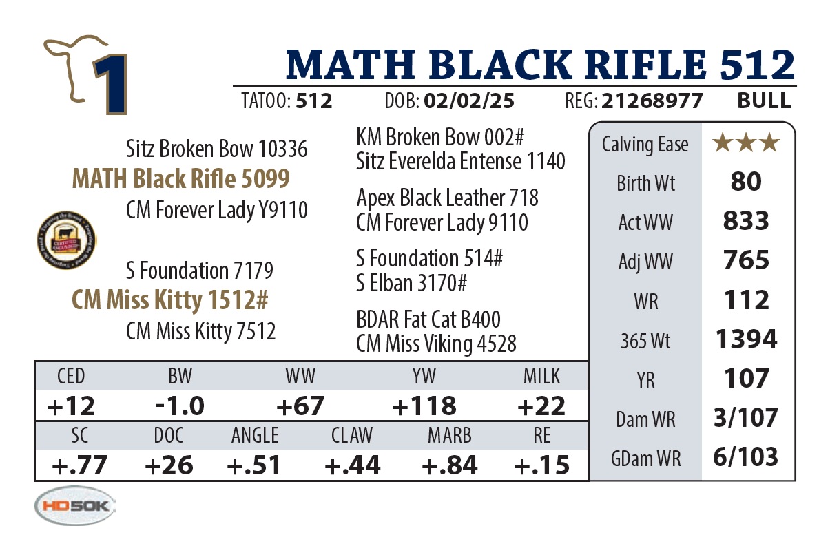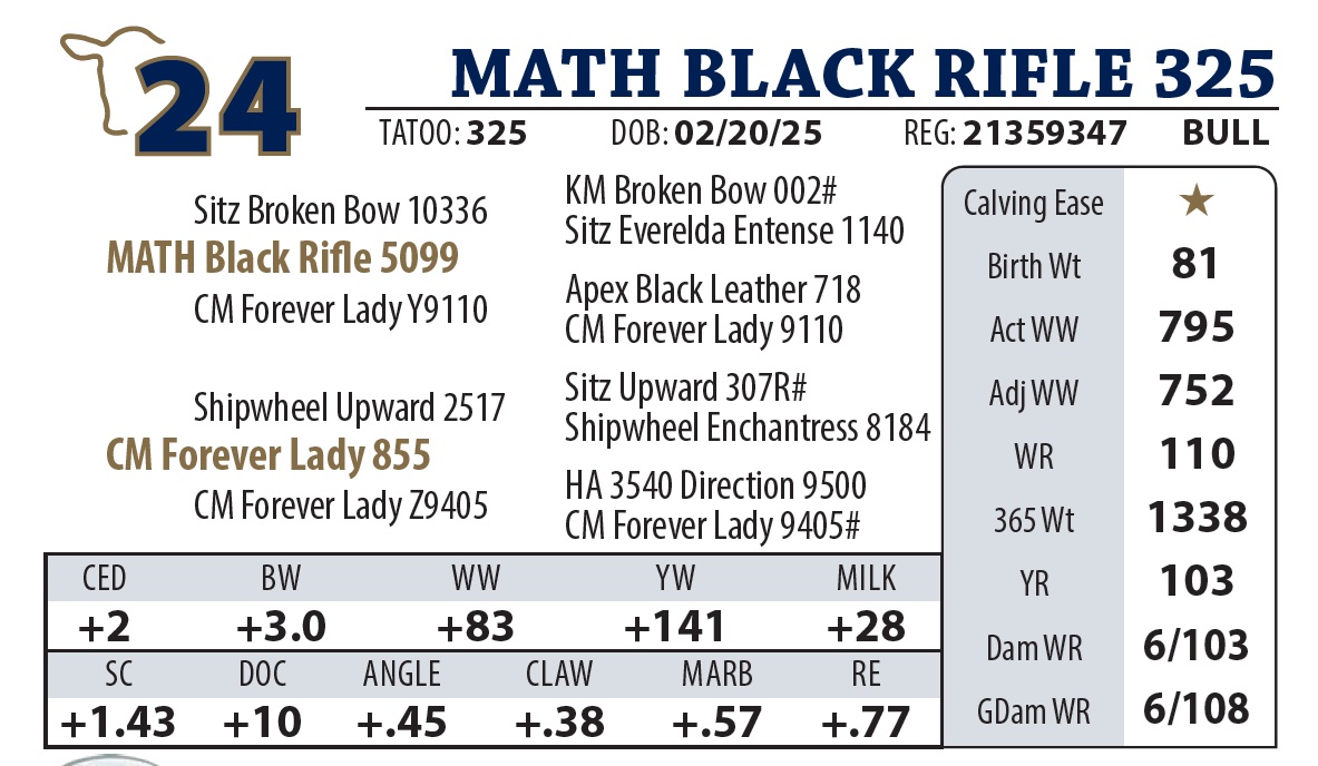 | MATH BLACK RIFLE 325 | 24Y | YEARLING BULL | A top-tier Black Rifle son out of one of the best Upward daughters on the ranch |