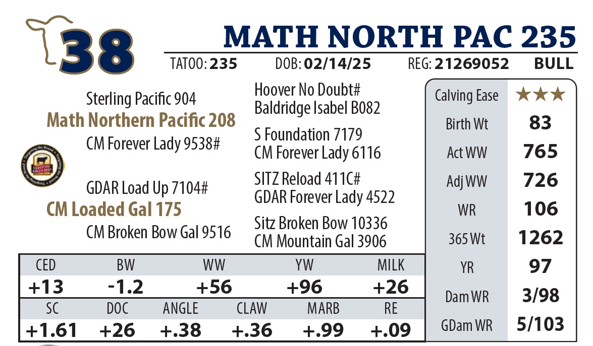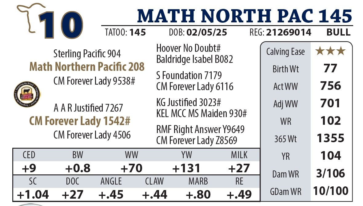 | MATH NORTH PAC 145 | 10Y | YEARLING BULL | A premier Northern Pacific son and a definite “Sale Feature.” Great dispostion and a performance bull with a calving ease EPD’s. His Justified dam is the definition of “working class,” hitting Pathfinder status by her third calf. |