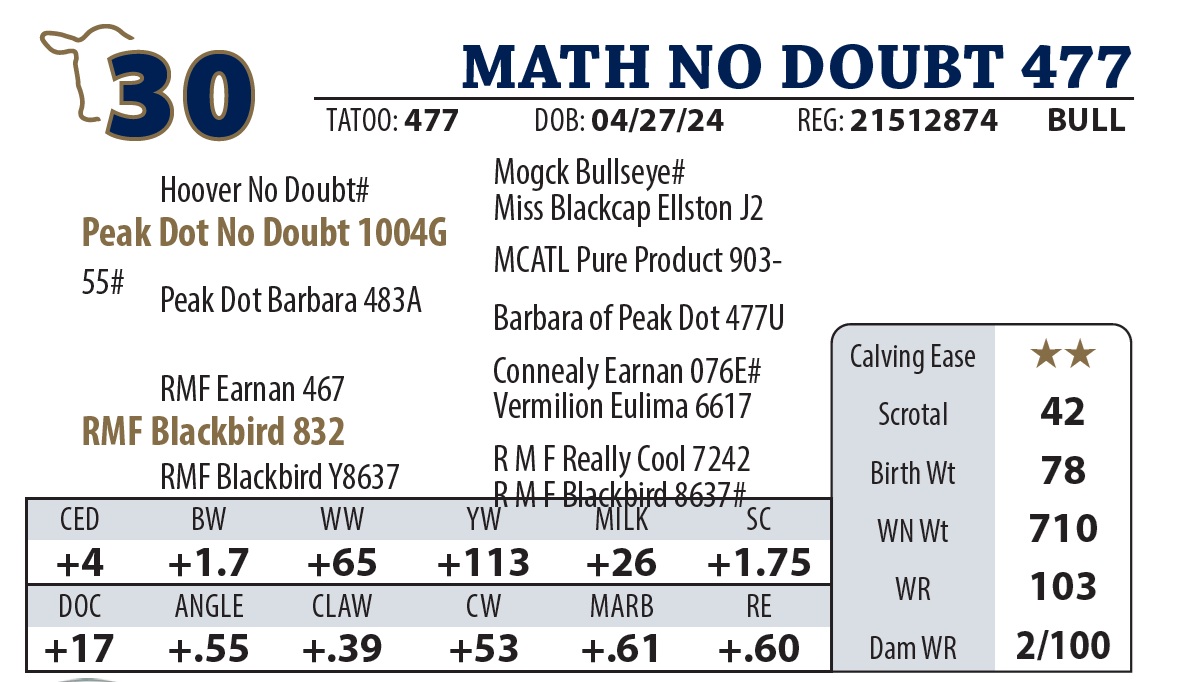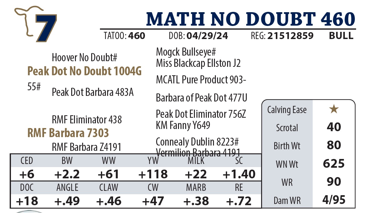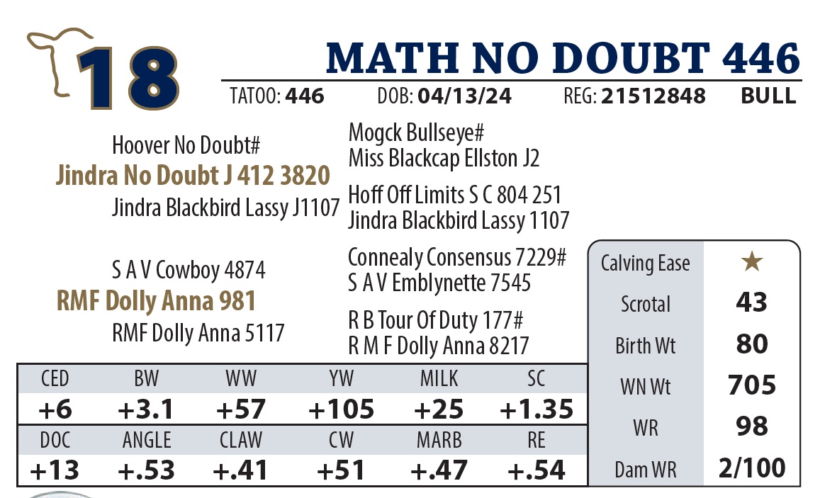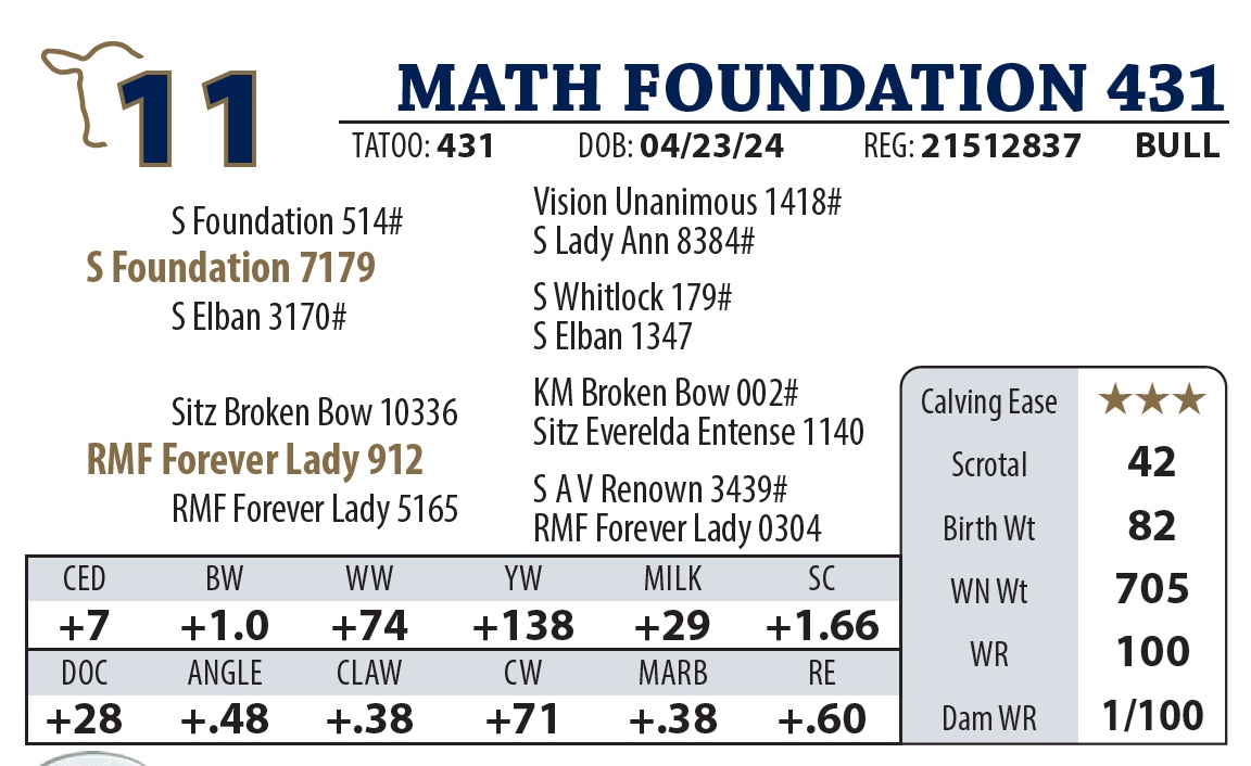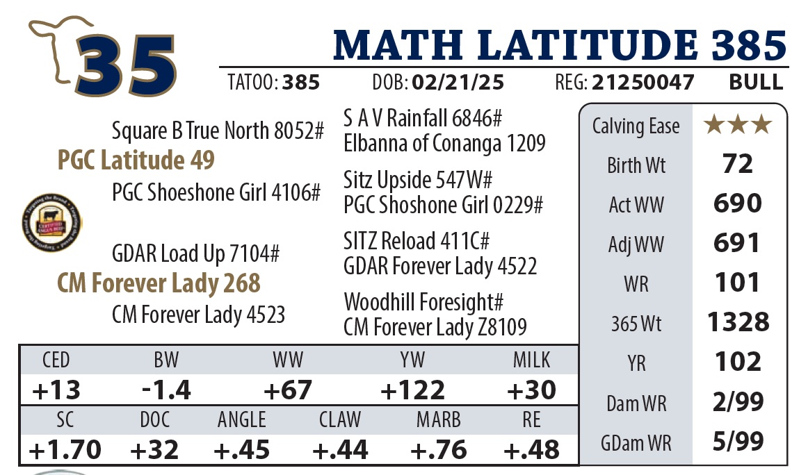 | MATH LATITUDE 385 | 35Y | YEARLING BULL | This bull is as deep as they get. |