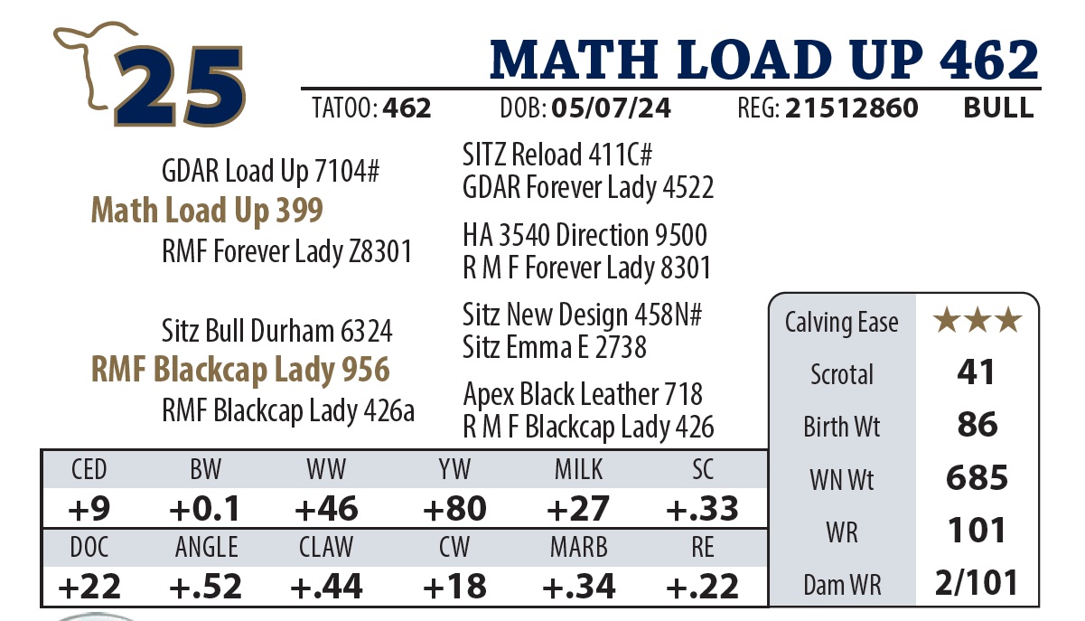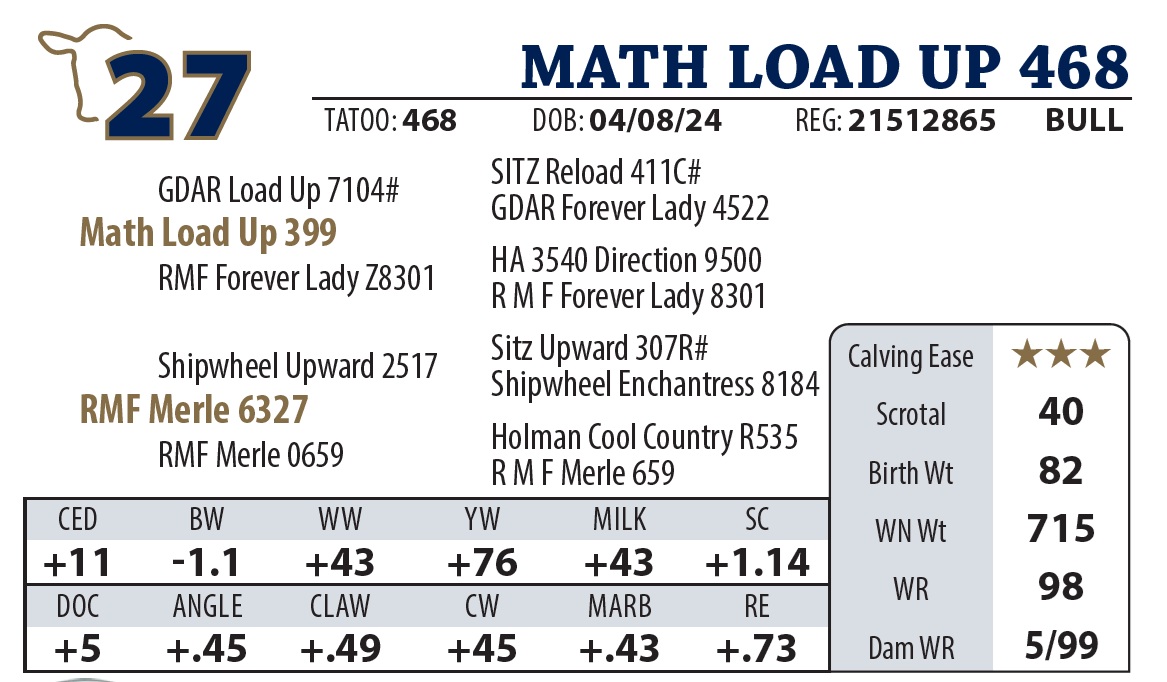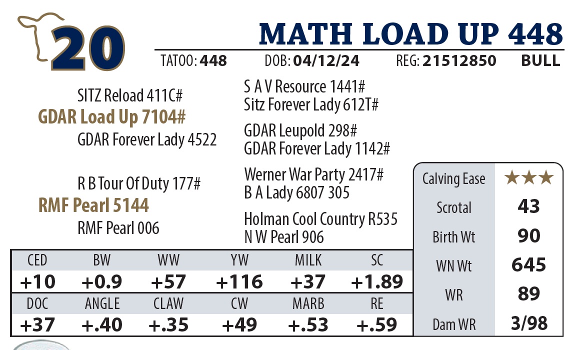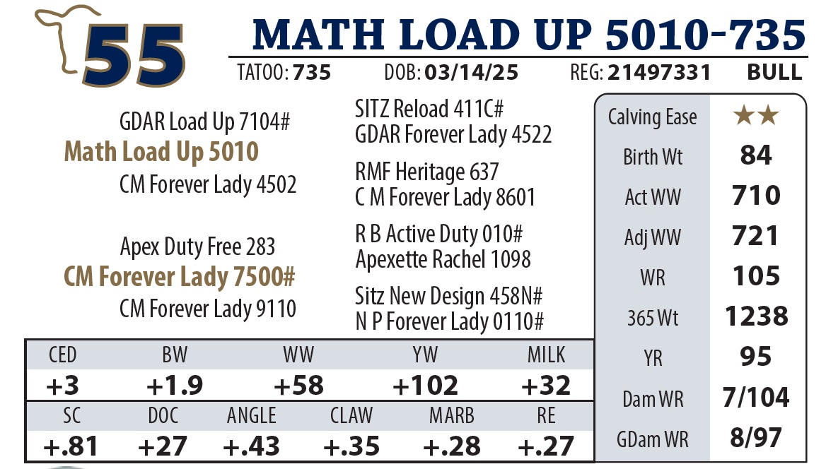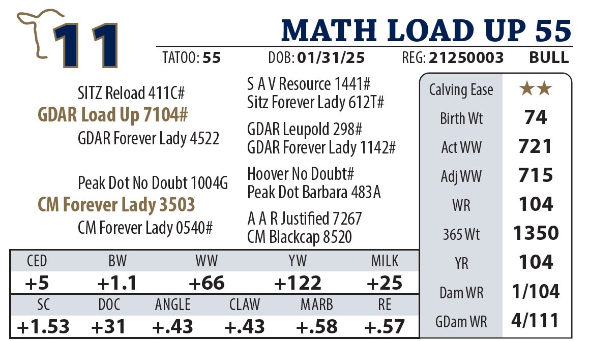 | MATH LOAD UP 55 | 11Y | YEARLING BULL | Another nice Load Up son with a strong top. Granddam made pathfinder this year. |