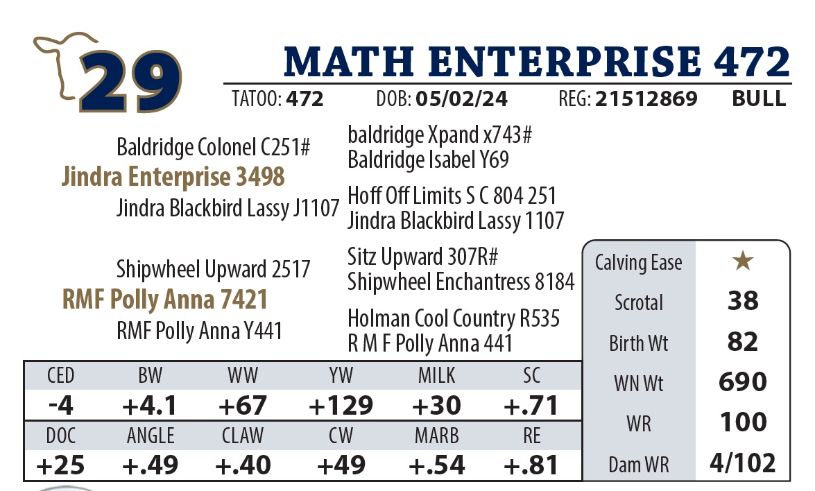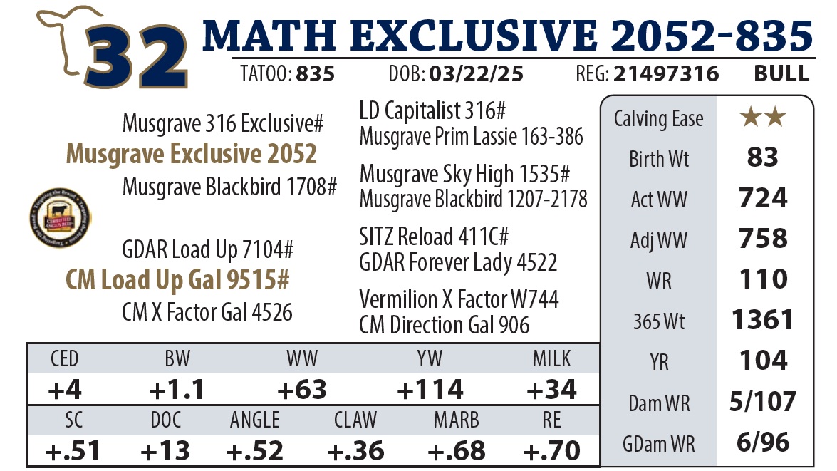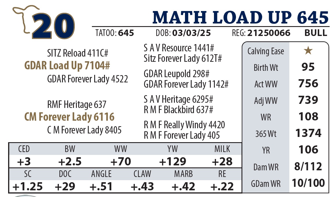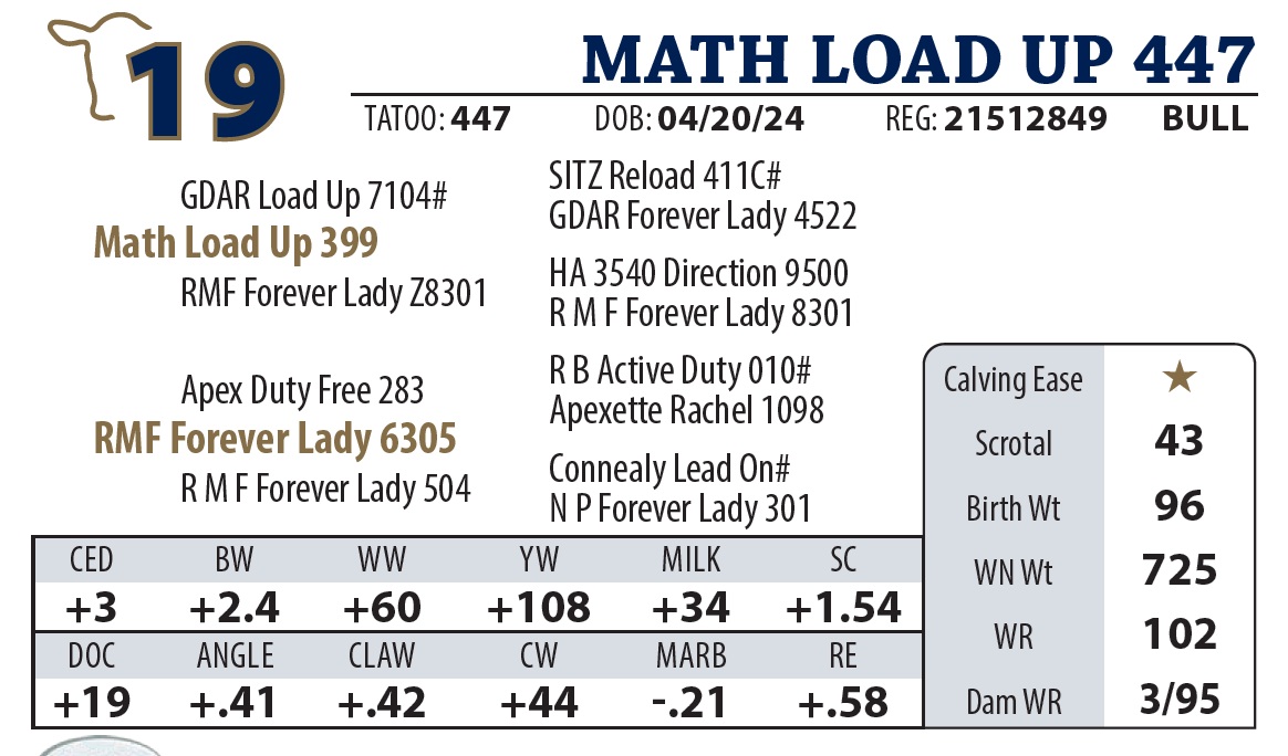 | MATH LOAD UP 55 | 11Y | YEARLING BULL | Another nice Load Up son with a strong top. Granddam made pathfinder this year. |