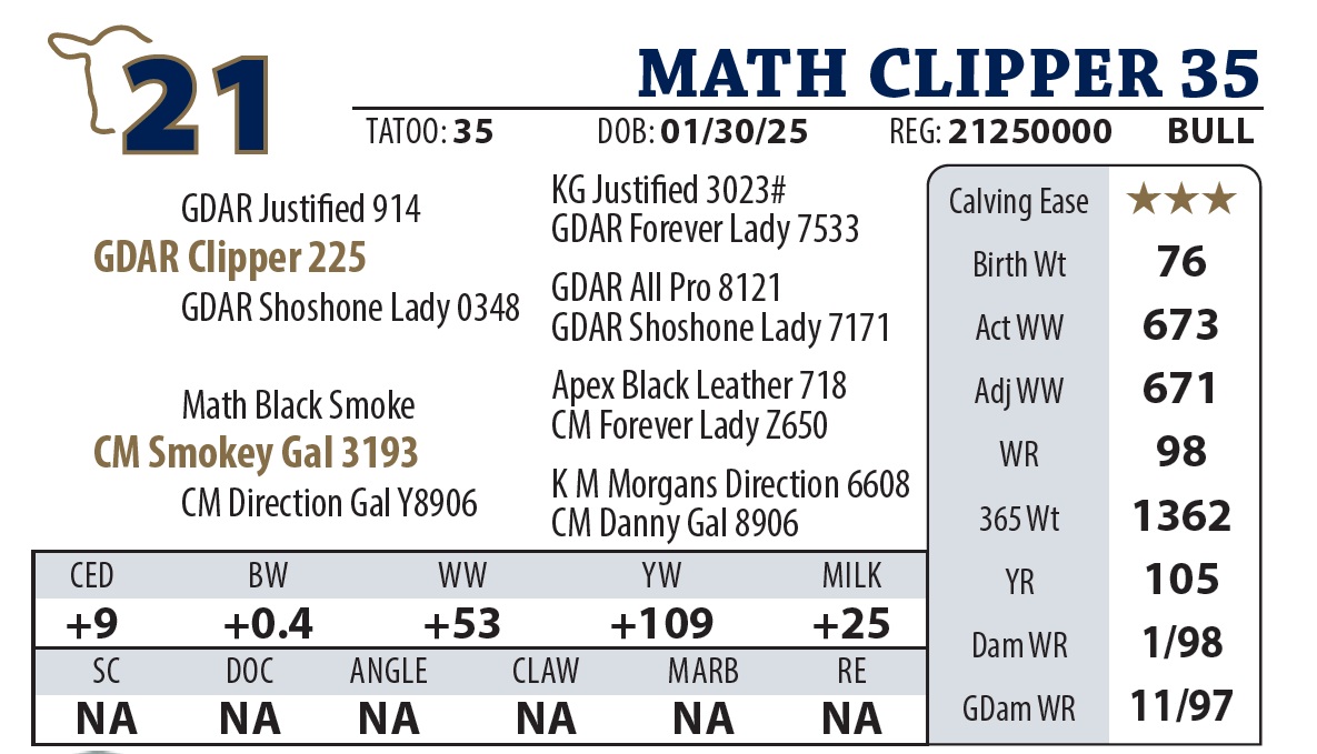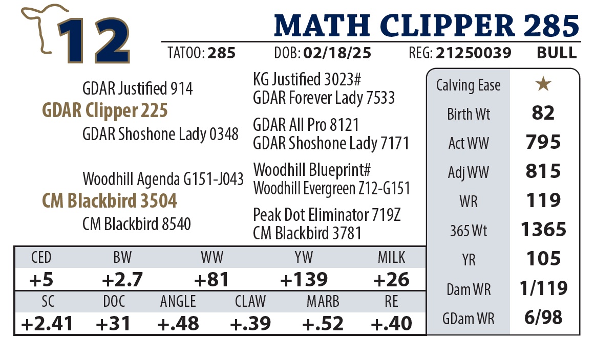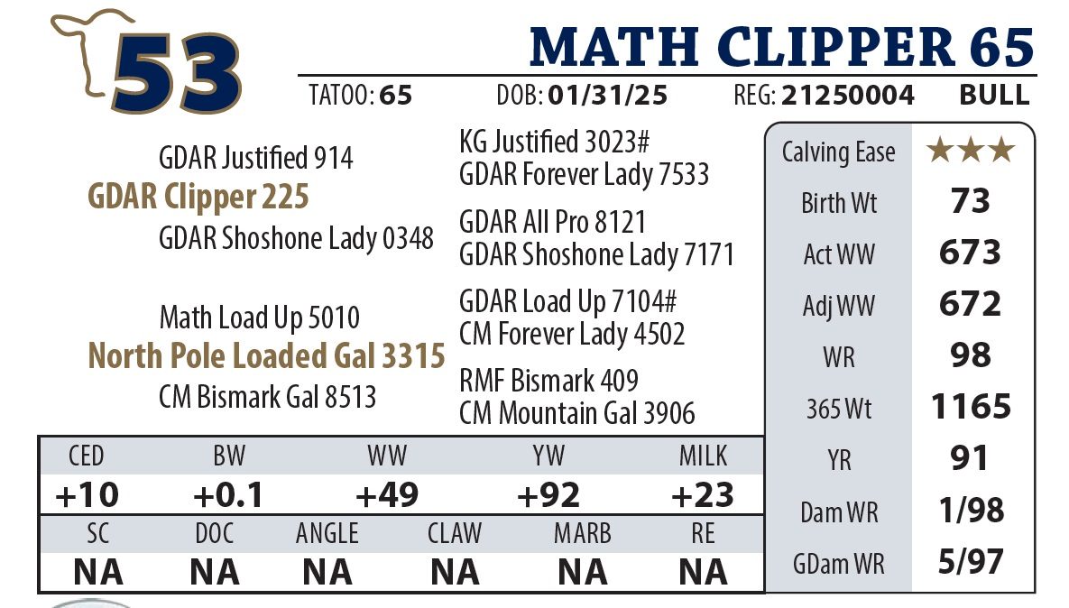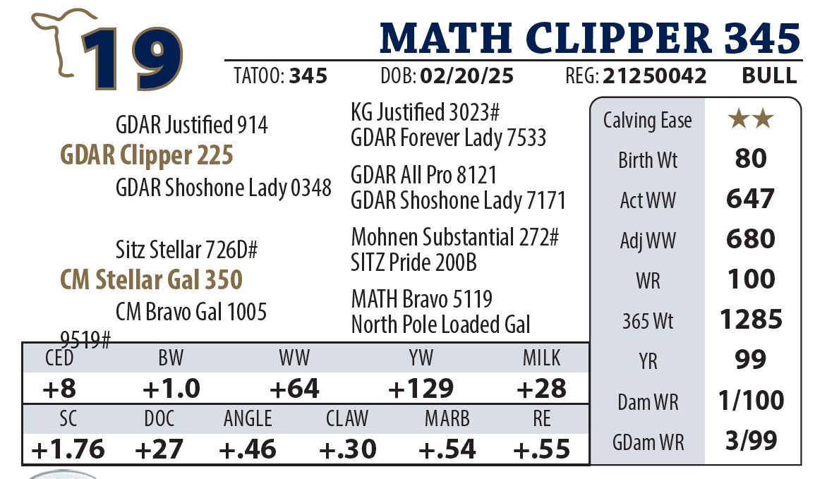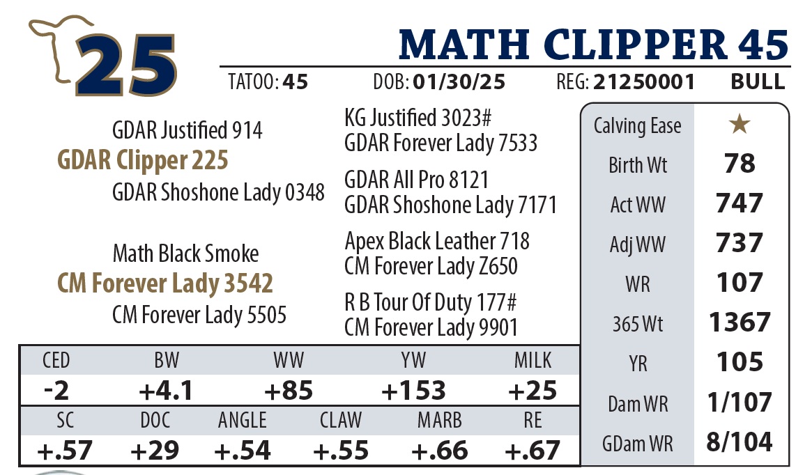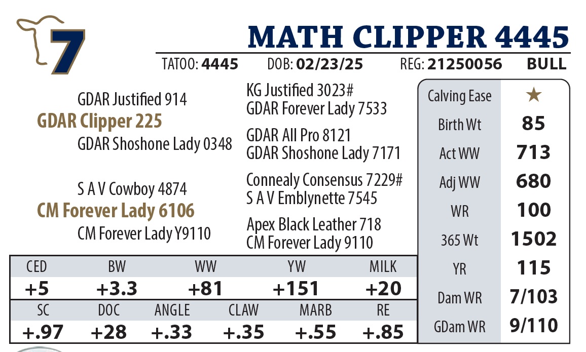 | MATH CLIPPER 4445 | 7Y | YEARLING BULL | A “Sale Feature” by GDAR Clipper. He’s a thick-made, big-ended powerhouse that led the group with a staggering 5 lb ADG. Despite his explosive growth, he’s backed by a calving-ease dam. The Clipper daughters are “lights out,” and with Forever Lady Y9110 as his grandam, he’s a front-row candidate for building a cowherd. |