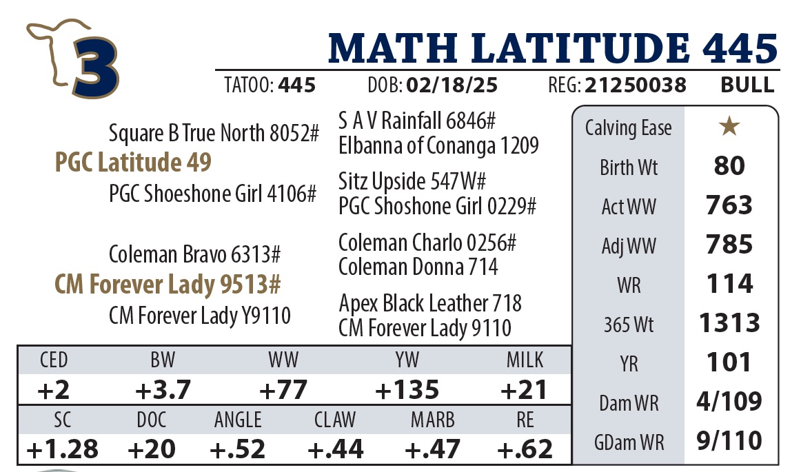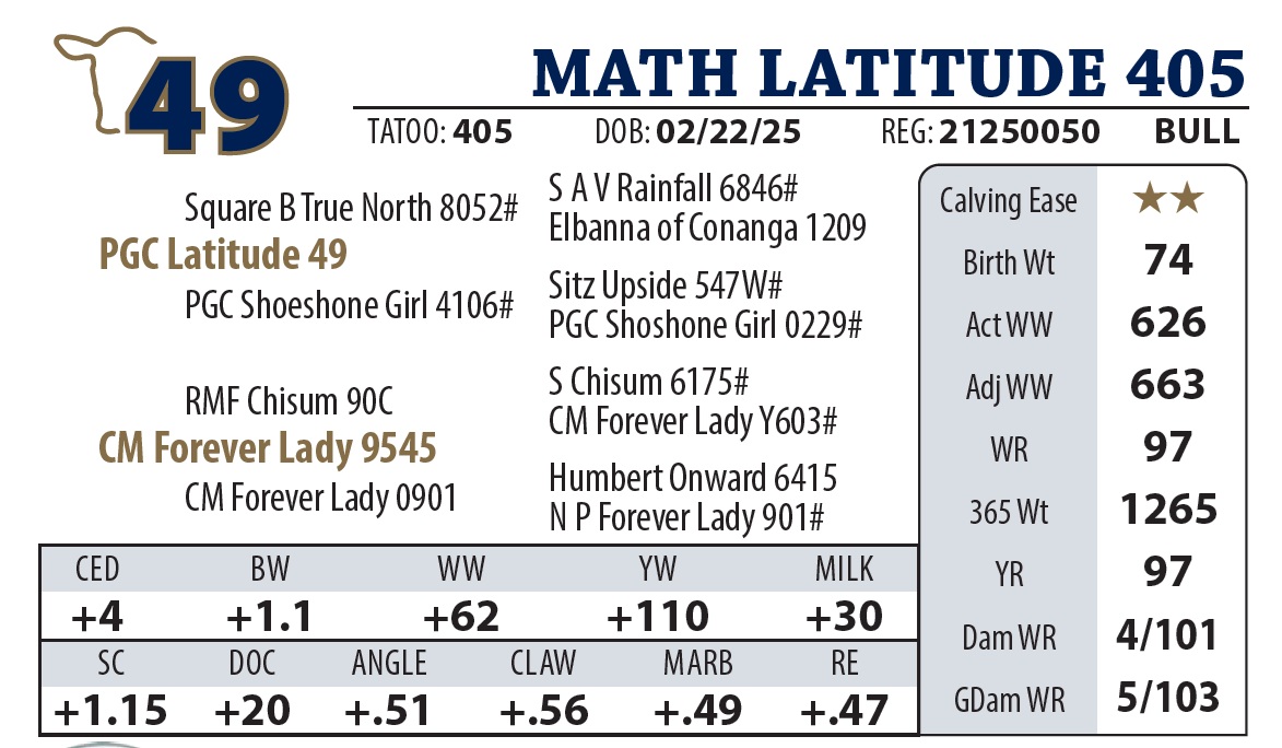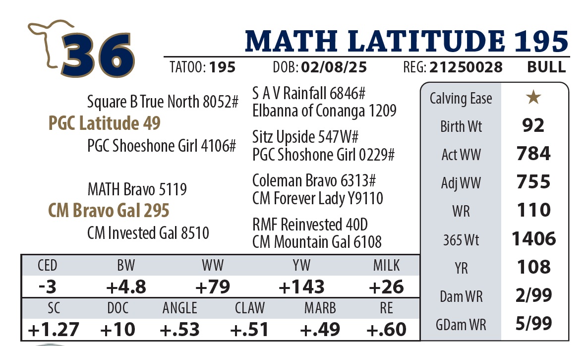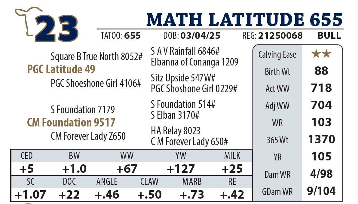 | MATH LATITUDE 655 | 23Y | YEARLING BULL | Good numbers on this Latitude son. Granddam was a donor cow and gets credit for the highest selling bull in our history. |