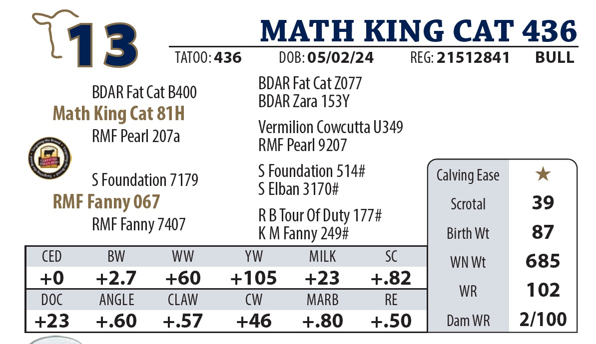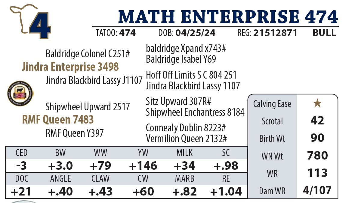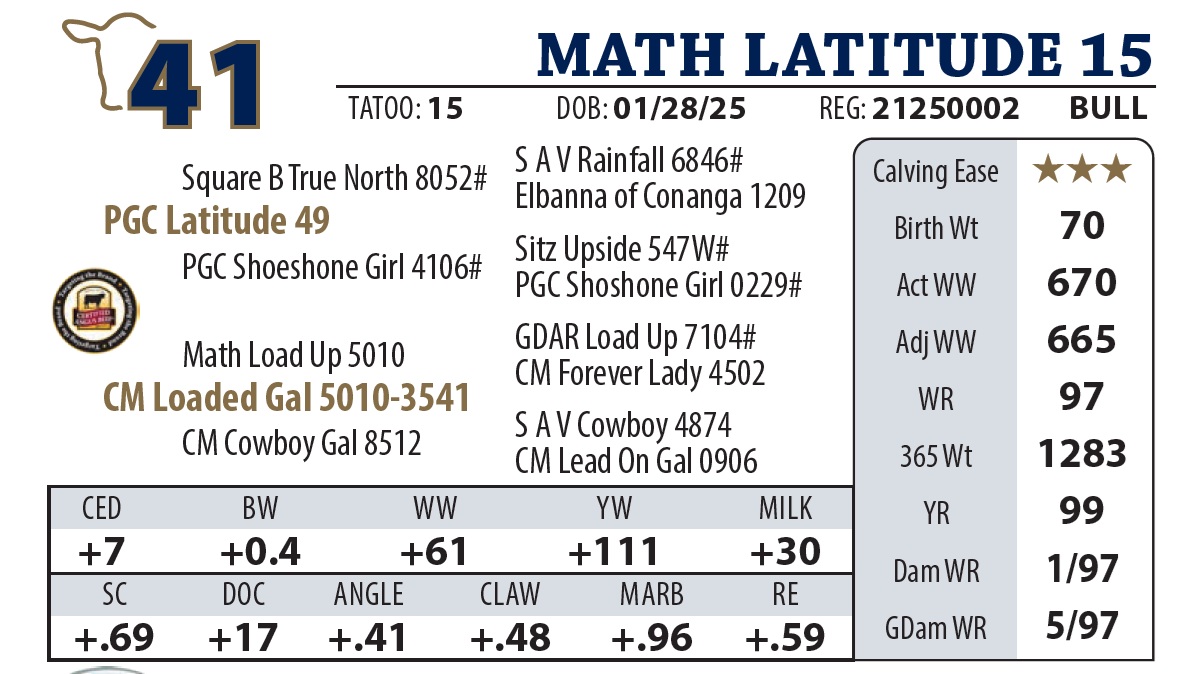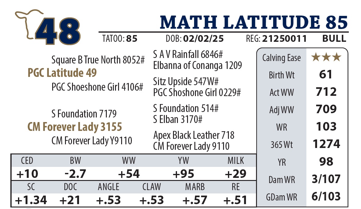 | MATH LATITUDE 655 | 23Y | YEARLING BULL | Good numbers on this Latitude son. Granddam was a donor cow and gets credit for the highest selling bull in our history. |