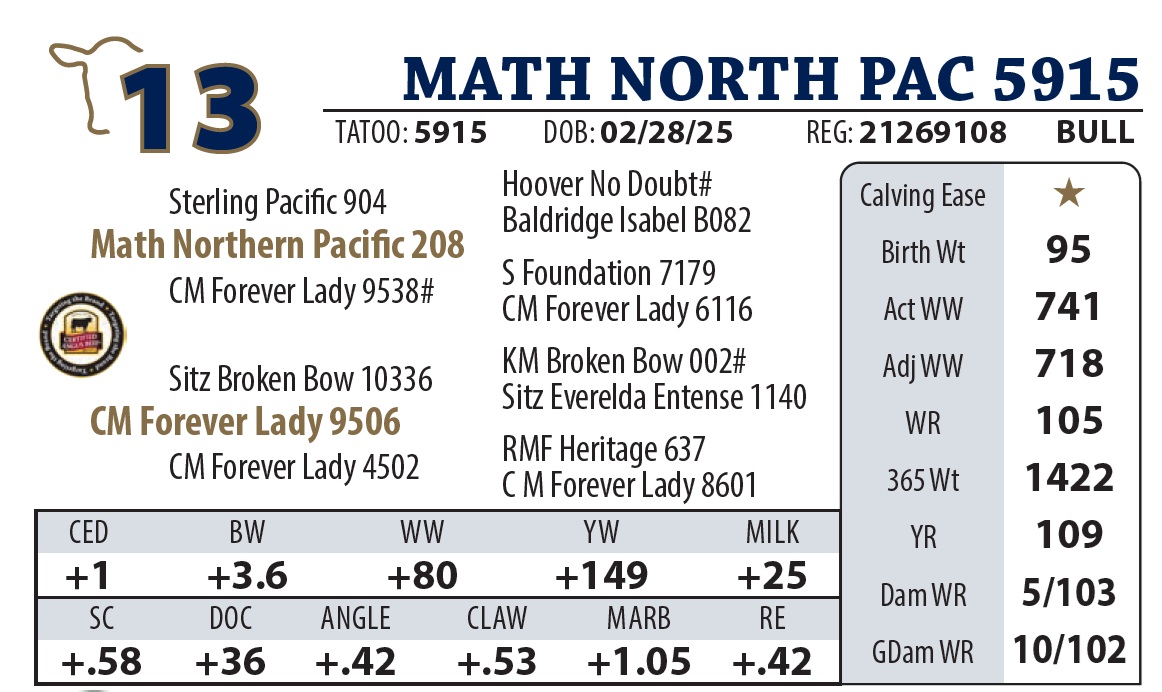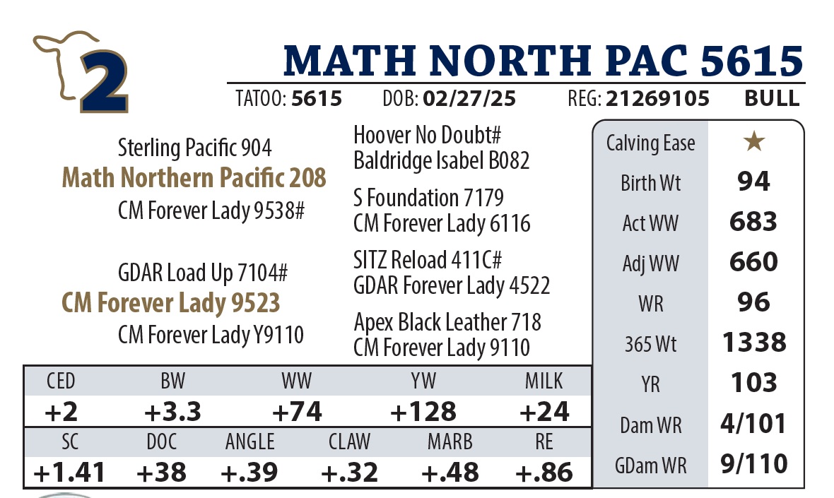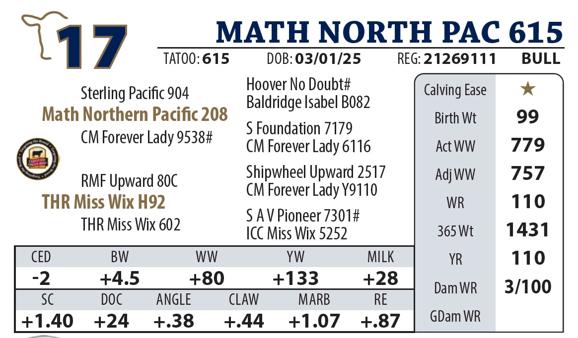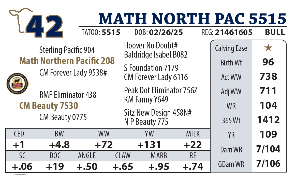 | MATH NORTH PAC 615 | 17Y | YEARLING BULL | Another Northern Pacific standout that balances eye appeal with “meat and potatoes” carcass numbers. His pedigree traces back to a highselling Y9110 son, proving the quality is bred deep. |