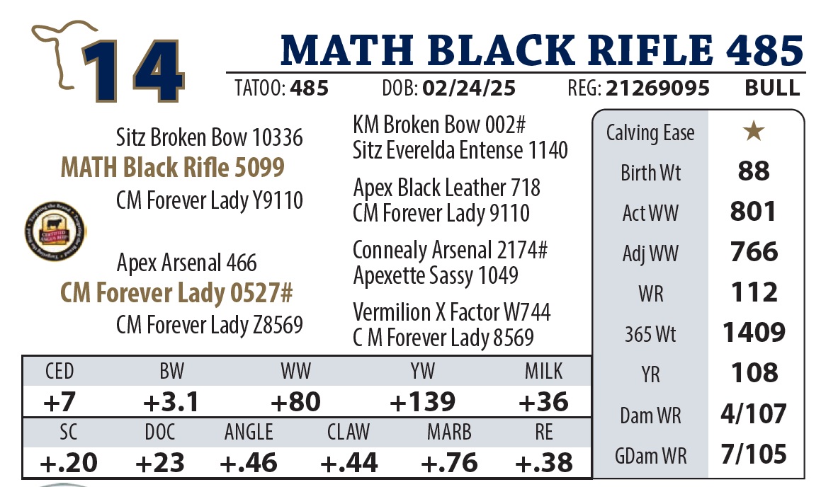 | MATH BLACK RIFLE 485 | 14Y | YEARLING BULL | f you’re looking to stretch out a set of calves, this guy is a stud. He’s got that extra frame and length of spine that adds pounds to a scale ticket. He has a small tick of white under him, but his performance and docile disposition are flawless. |