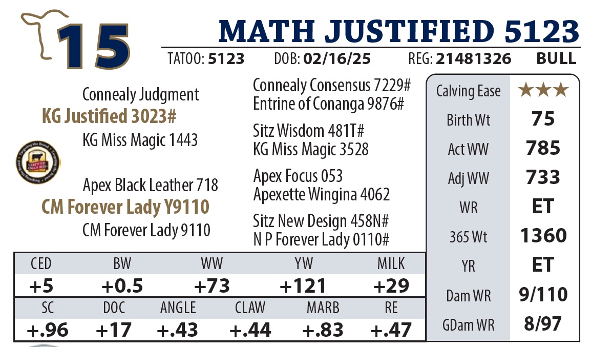 | MATH JUSTIFIED 5123 | 15Y | YEARLING BULL | A high-uniformity flush of ET brothers out of the matriarch Forever Lady Y9110. These Justified sons are long-bodied, strong-topped, and exceptionally calm. |