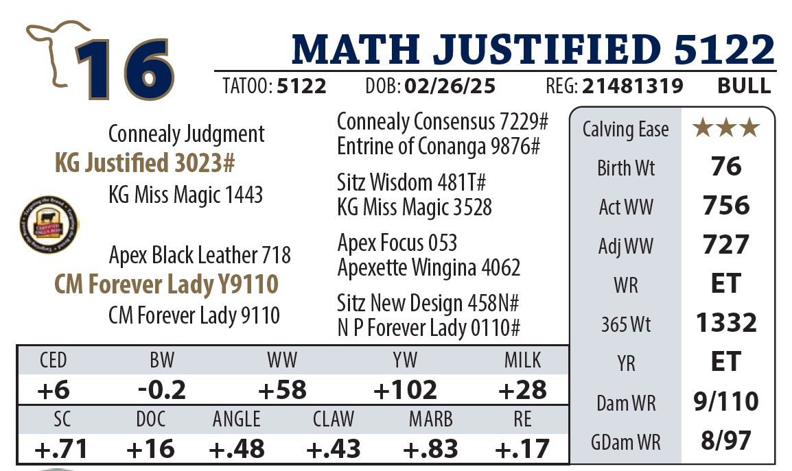 | MATH JUSTIFIED 5122 | 16Y | YEARLING BULL | These four bulls from Justified x Forever Lady Y9110 sons will not be missed on sale day. If your goal is quality replacements, look here. |