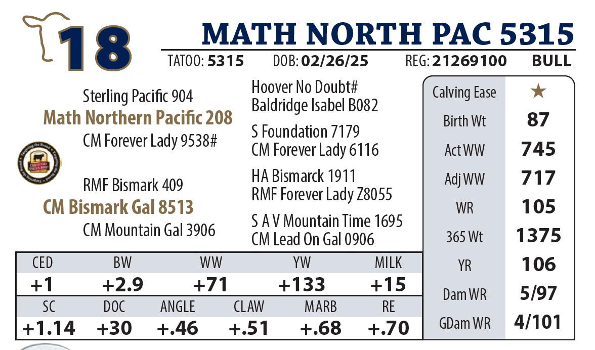 | MATH NORTH PAC 5315 | 18Y | YEARLING BULL | A high-performance Northern Pacific son with a great disposition and plenty of eye appeal. |