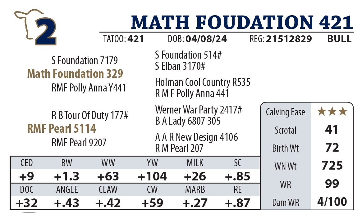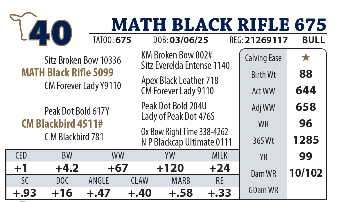 | MATH BLACK RIFLE 675 | 40Y | YEARLING BULL | Pathfinder dam just keeps working for us. 12 years of age, and has another AI calf at her side this year. |