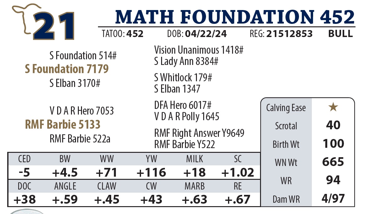 | MATH FOUNDATION 452 | 21 | AGED BULL | AGED BULL |