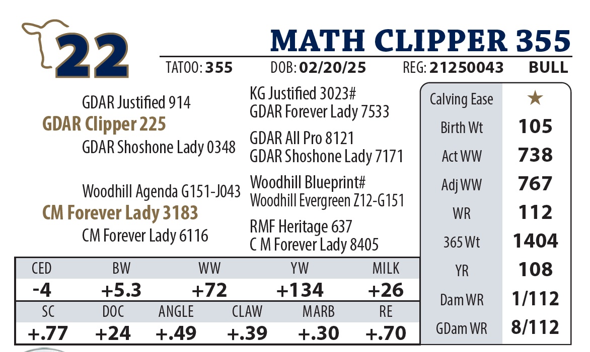 | MATH CLIPPER 355 | 22Y | YEARLING BULL | You won’t miss this standout from Clipper. Shares the same granddam as Northern Pacific, Forever Lady 6116. Proof is in the Pedigree. |