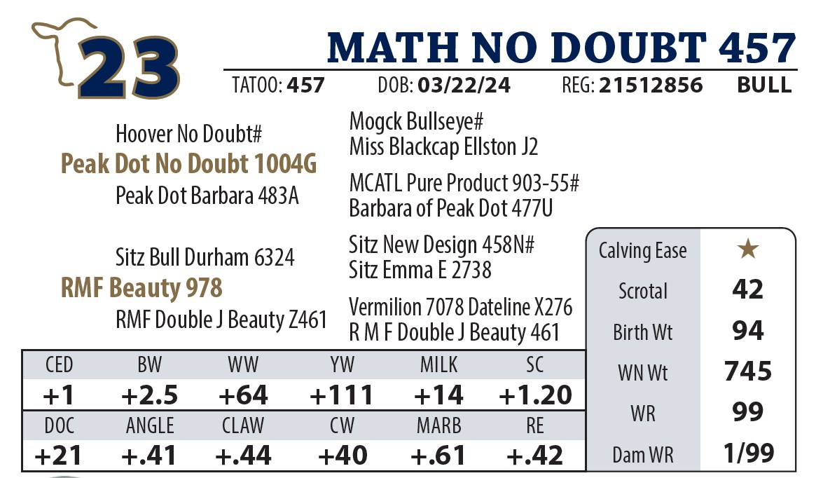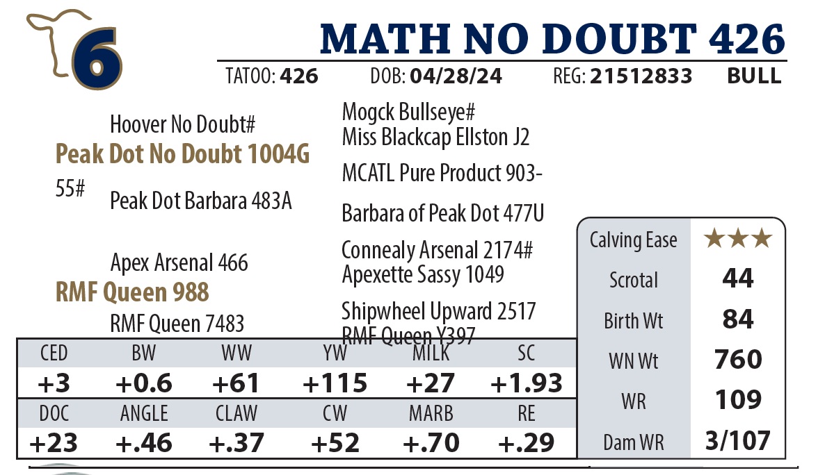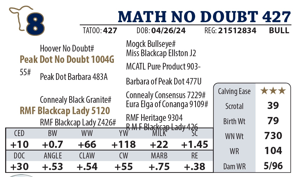 Another Northern Pacific standout that balances eye appeal with “meat and potatoes” carcass numbers. His pedigree traces back to a highselling Y9110 son, proving the quality is bred deep.