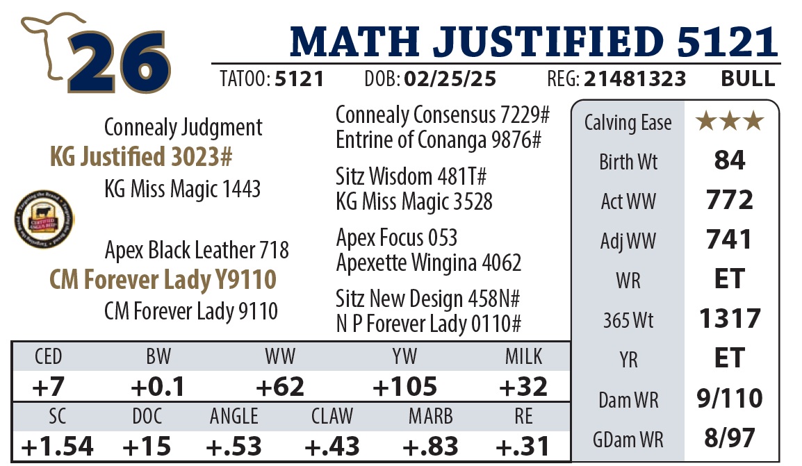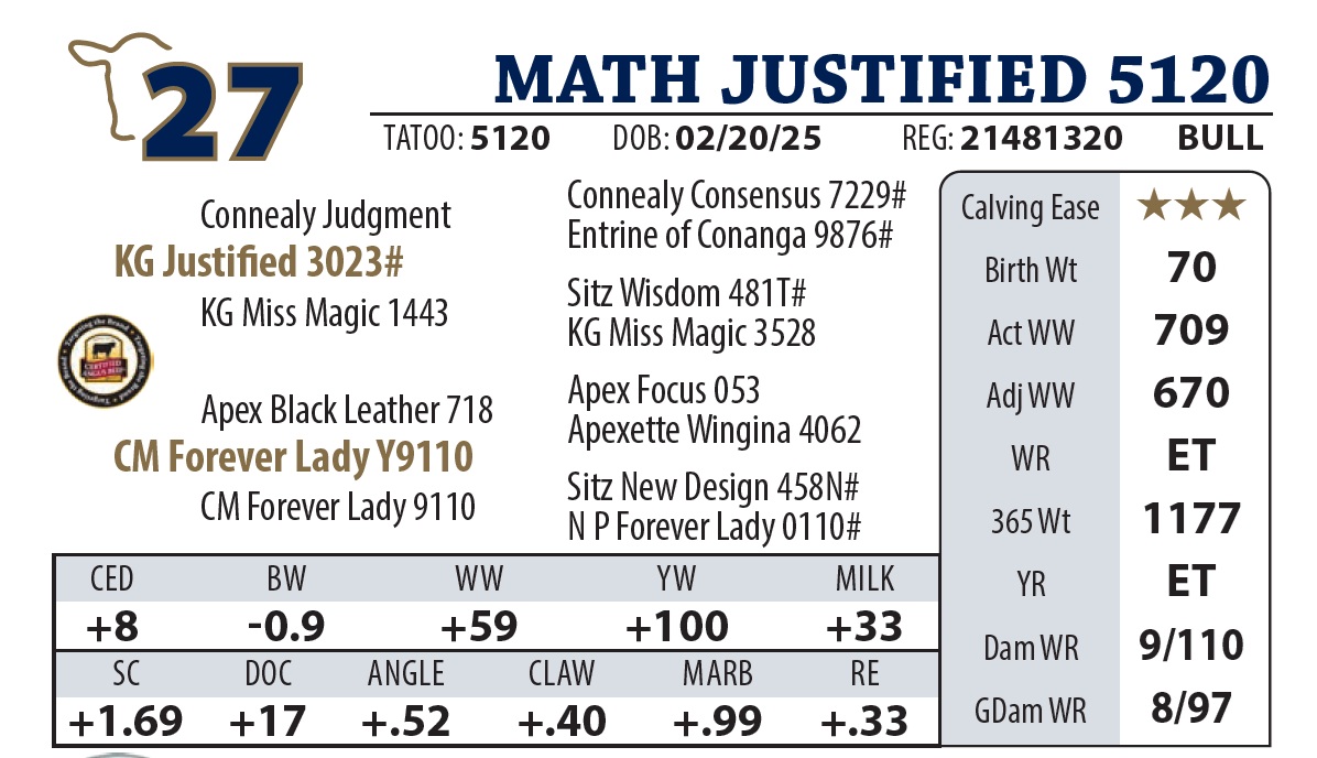 | MATH JUSTIFIED 5120 | 27Y | YEARLING BULL | |